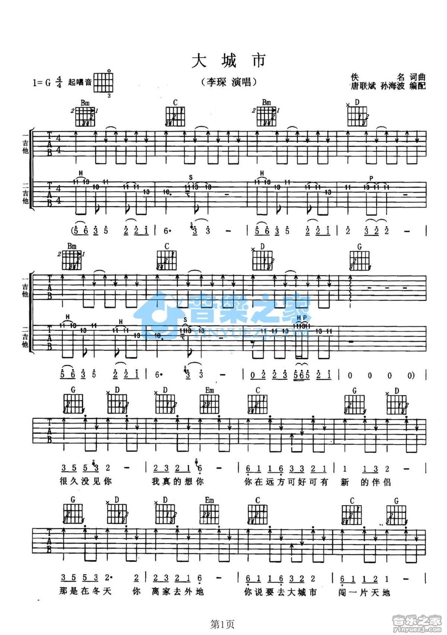 曲谱介绍: G调双吉他版李琛《大城市》吉他弹唱六线谱