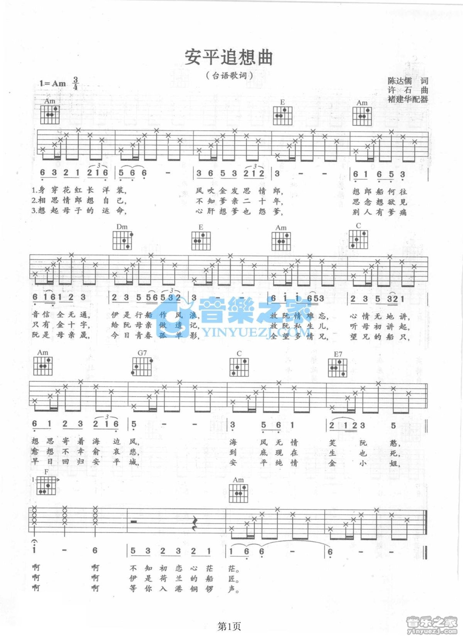 曲谱介绍: Am调版台语歌曲《安平追想曲》吉他弹唱六线谱
