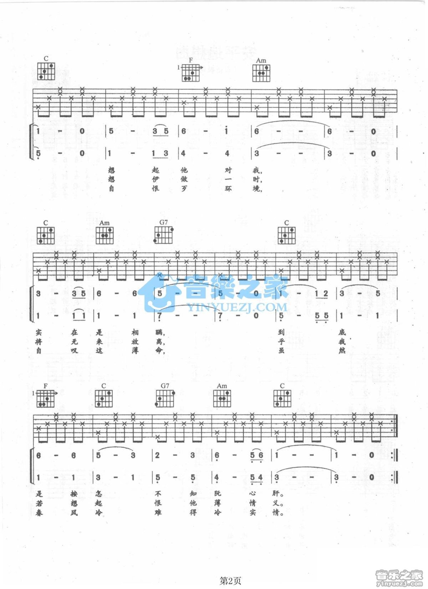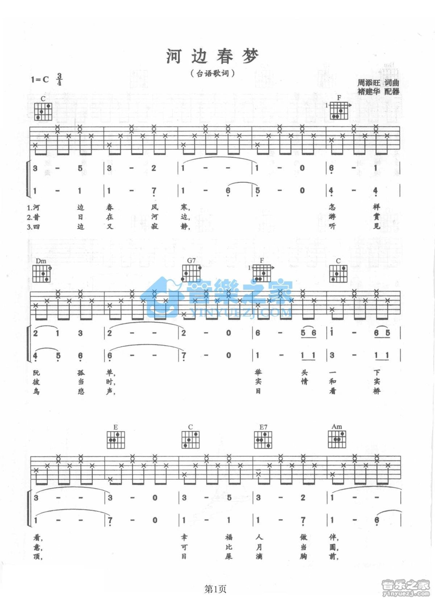曲谱介绍: C调版凤飞飞《河边春梦》吉他弹唱六线谱