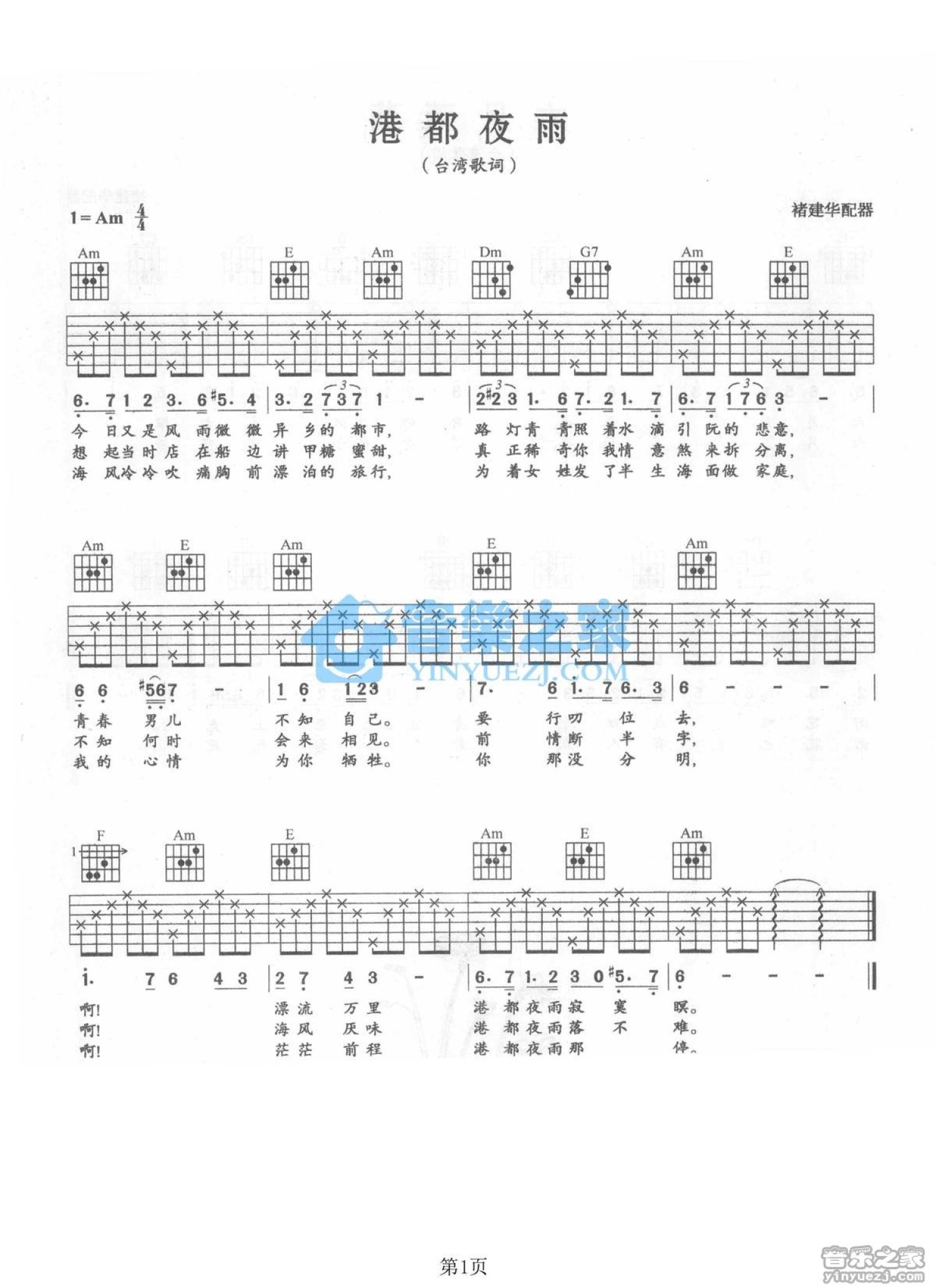曲谱介绍: Am调版蔡琴《港都夜雨》吉他弹唱六线谱