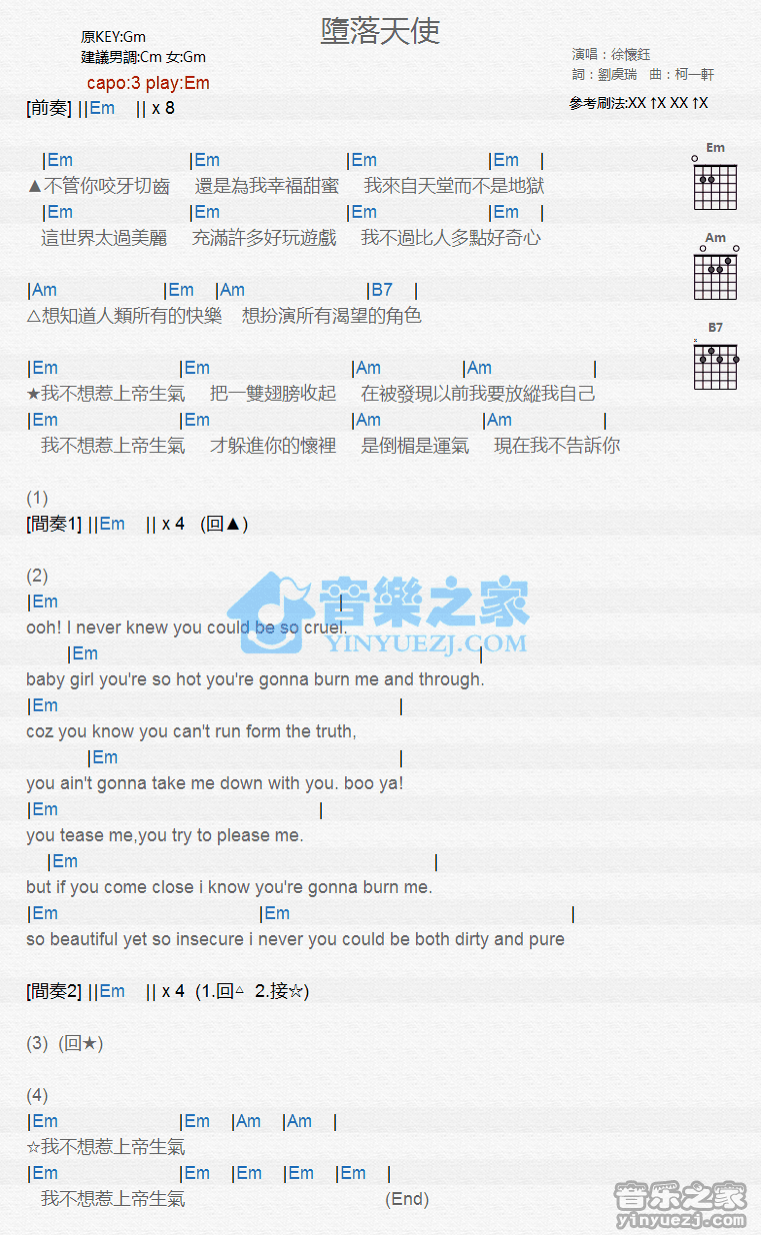 曲谱介绍: Em调版徐怀钰《堕落天使》吉他和弦弹唱谱