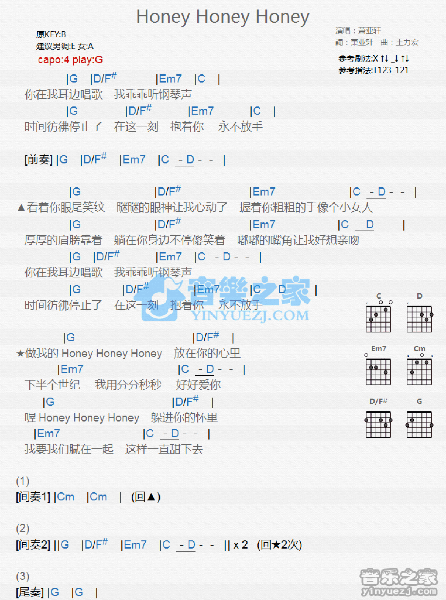 Honey Honey Honey吉他谱 - 萧亚轩 - G调吉他弹唱谱 - 和弦谱