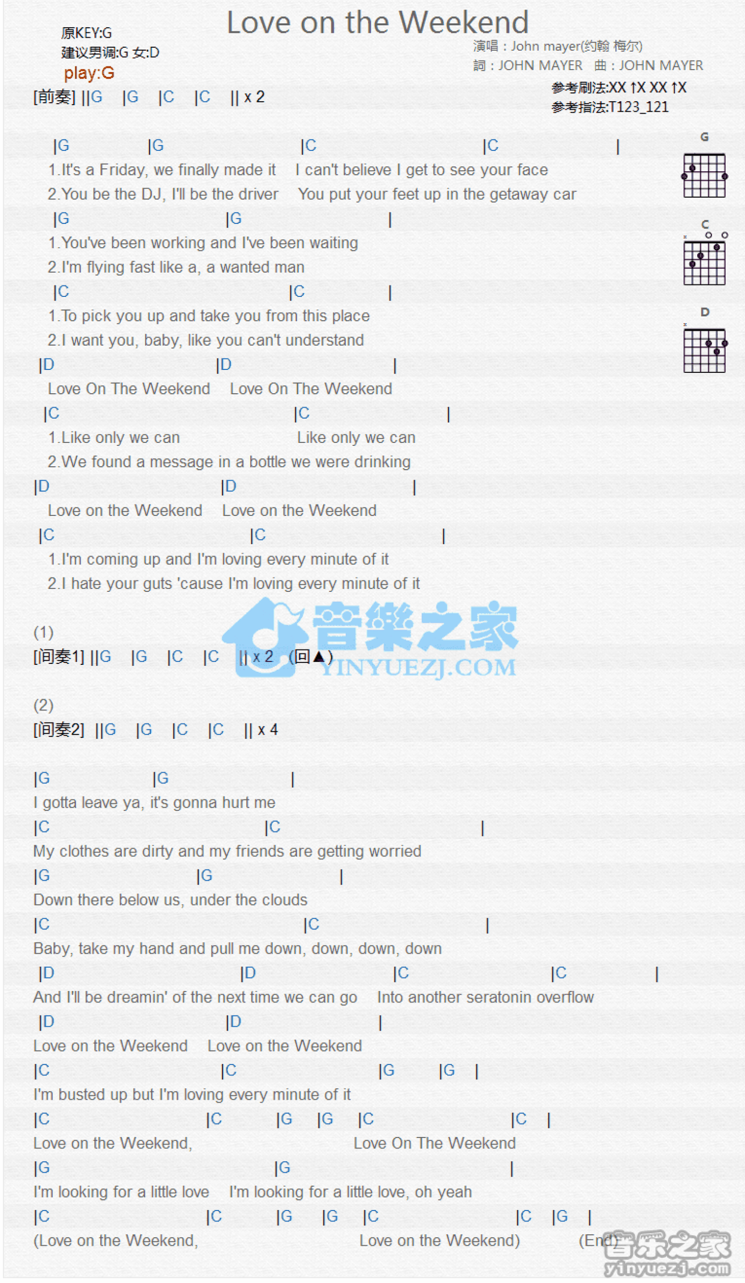 曲谱介绍: G调版ohnMayer《LoveOnTheWeekend》吉他和弦弹唱谱