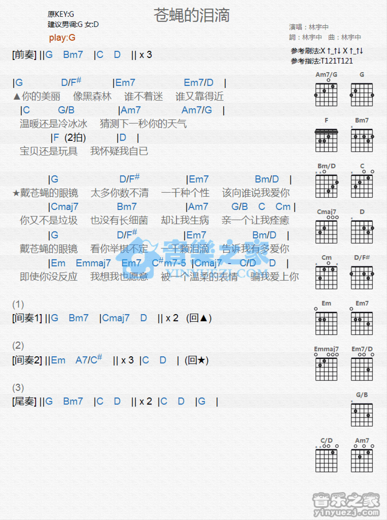 曲谱介绍: G调版林宇中《苍蝇的泪滴》吉他和弦弹唱谱