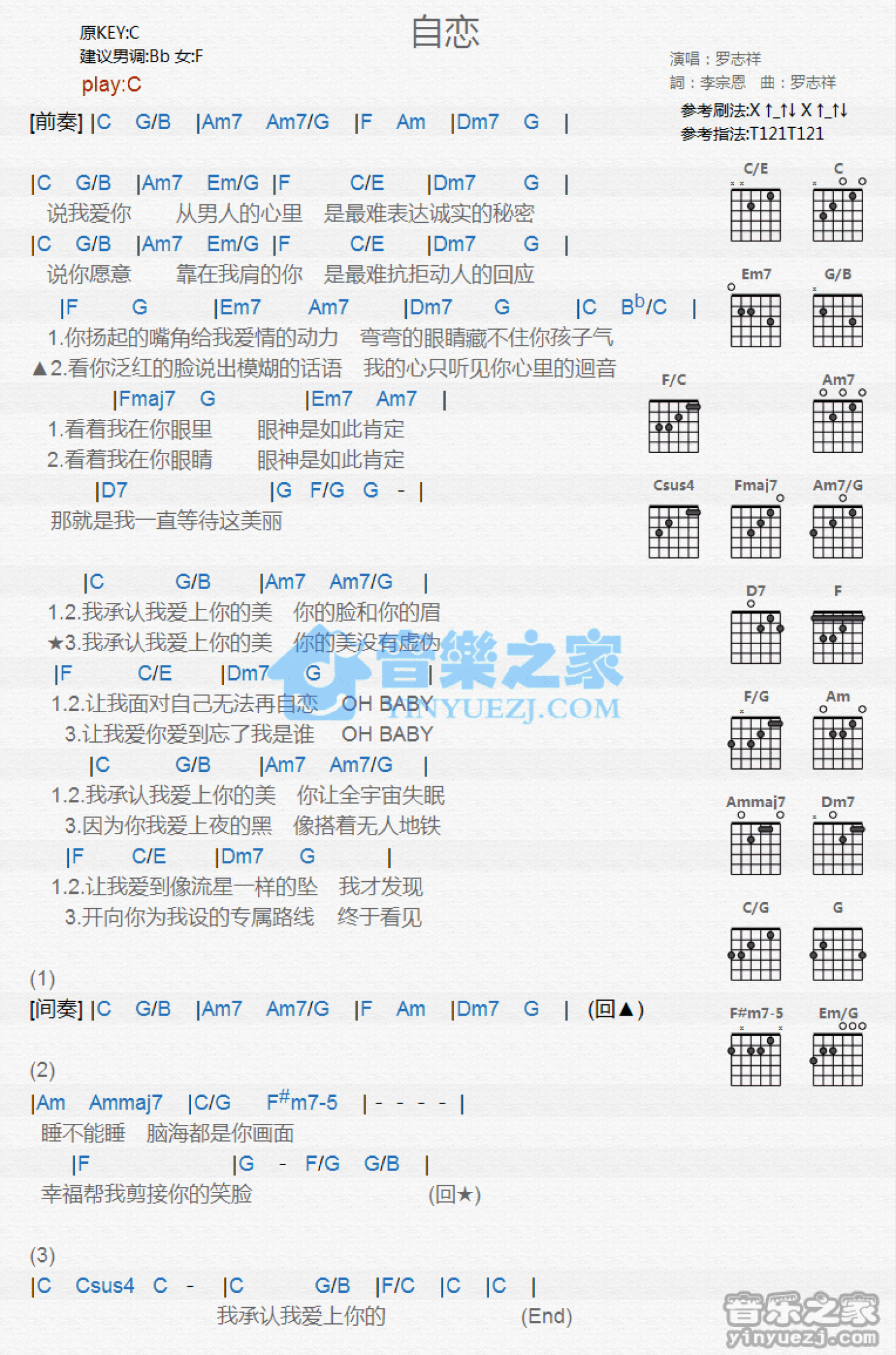 曲谱介绍: C调版罗志祥《自恋》吉他和弦弹唱谱