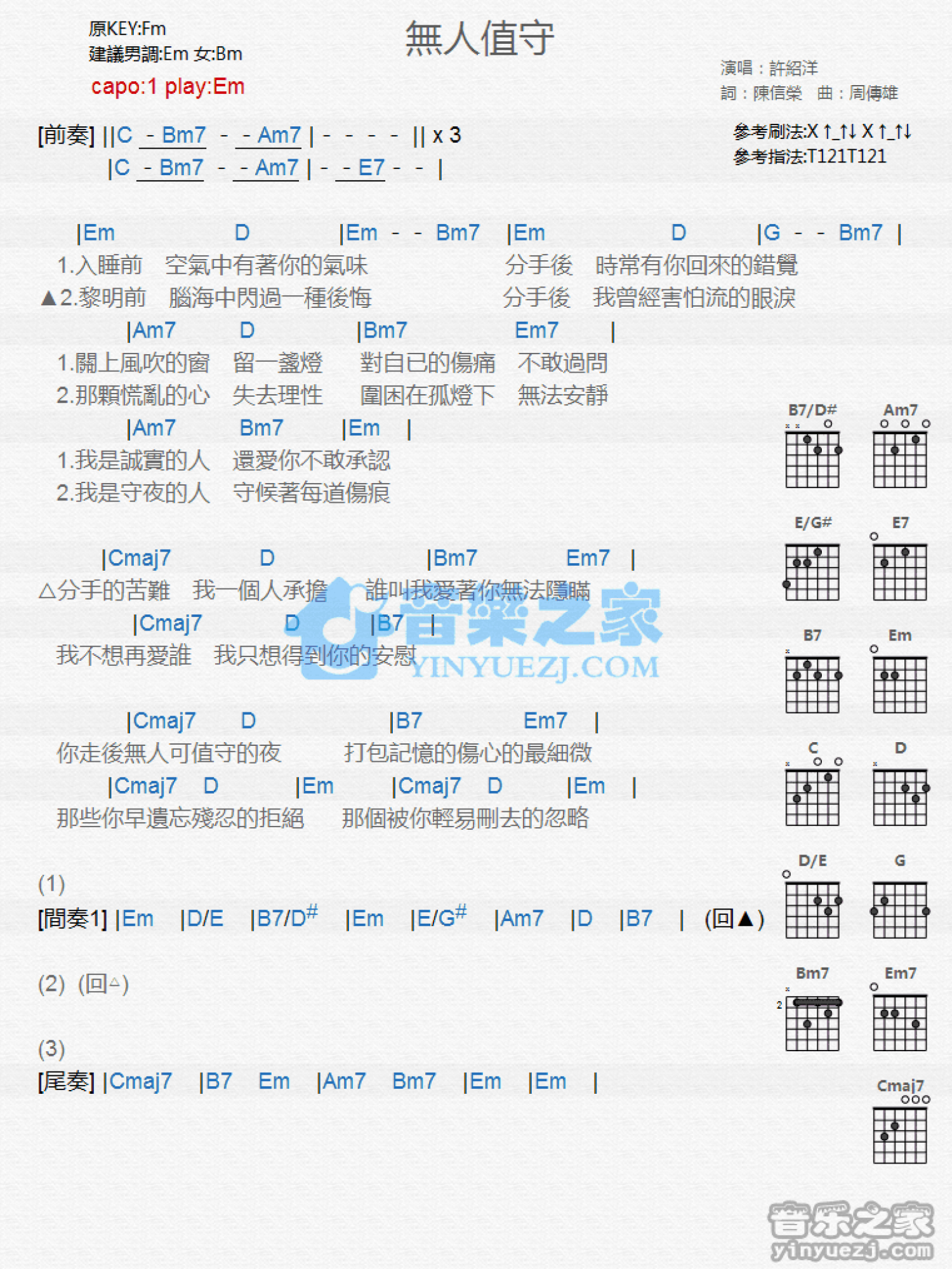曲谱介绍: Em调版许绍洋《无人值守》吉他和弦弹唱谱