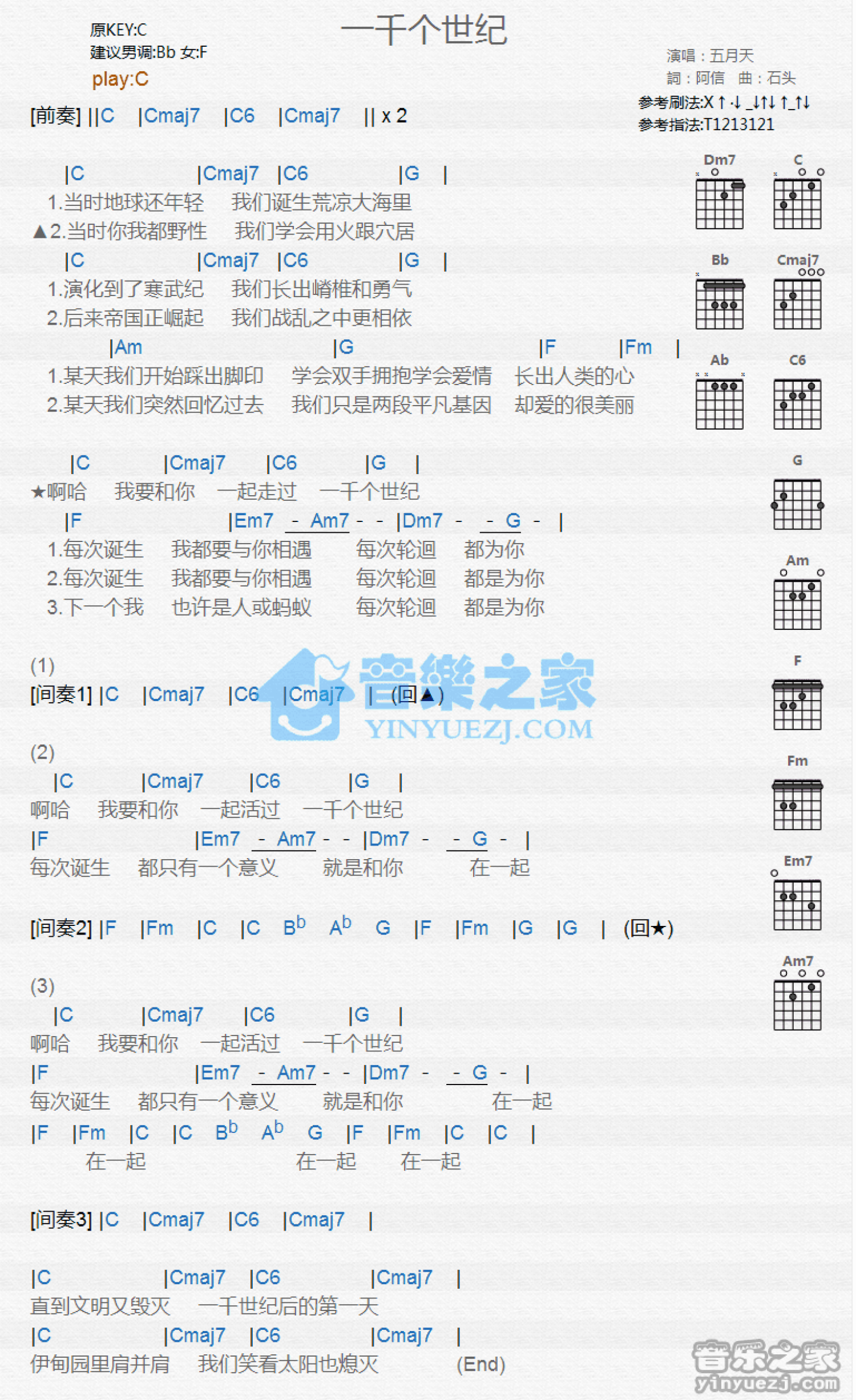 曲谱介绍: C调版五月天《一千个世纪》吉他和弦弹唱谱