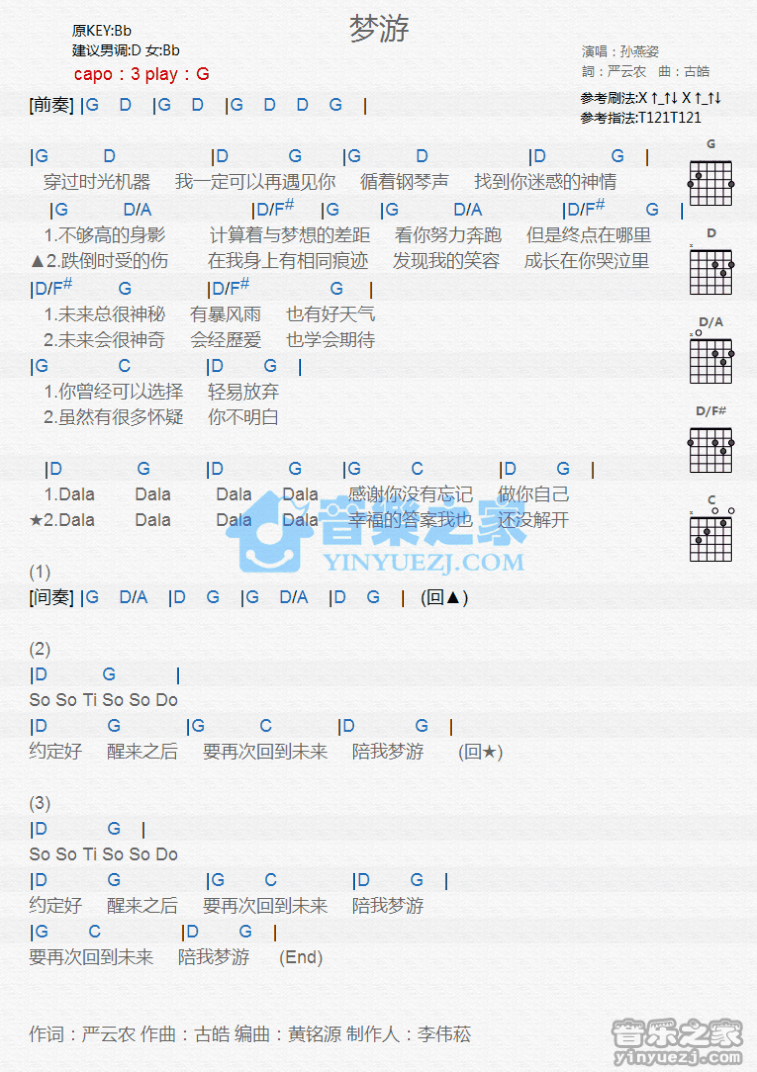 曲谱介绍: G调版孙燕姿《梦游》吉他和弦弹唱谱