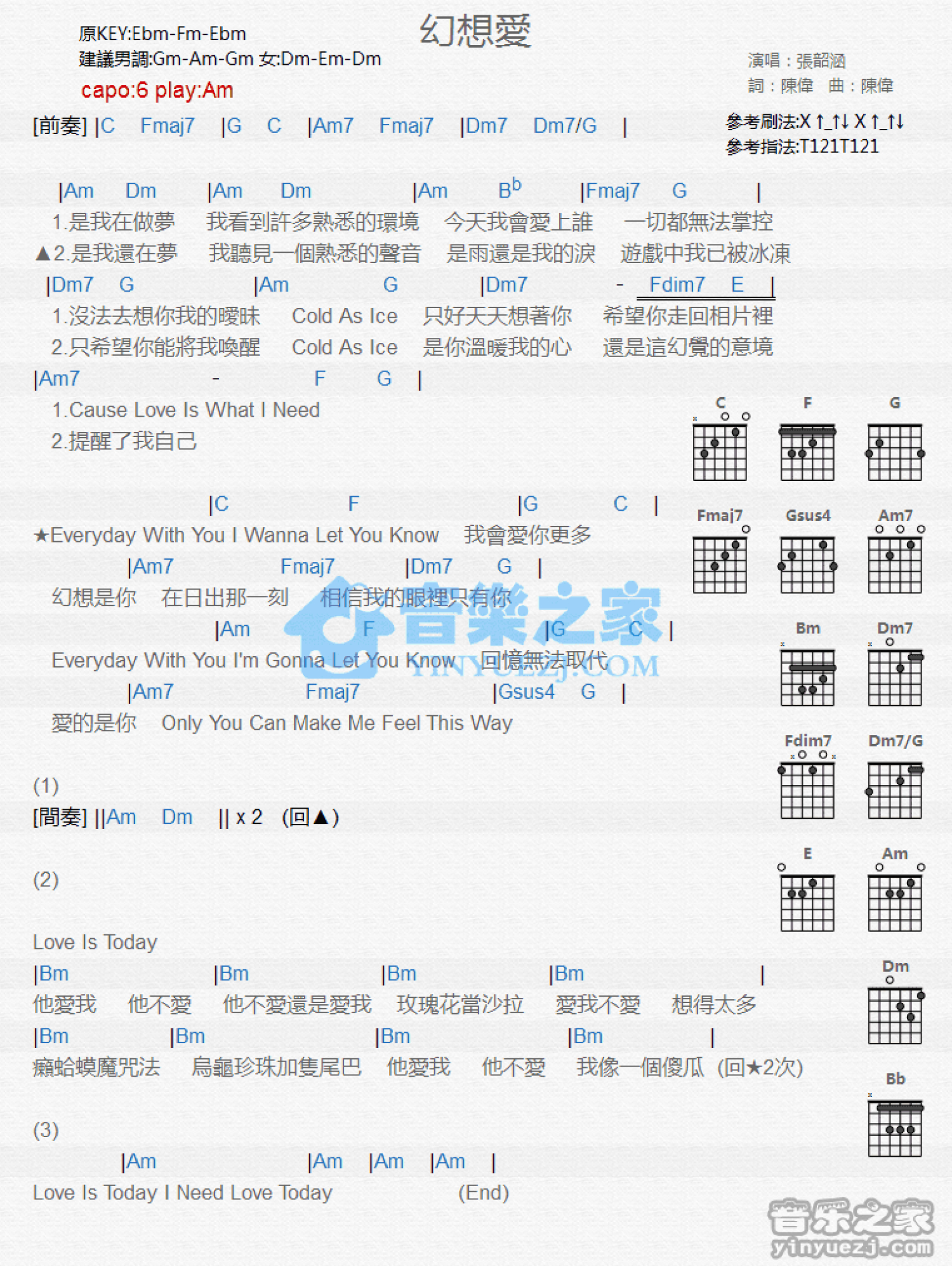 曲谱介绍: Am调版张韶涵《幻想爱》吉他和弦弹唱谱