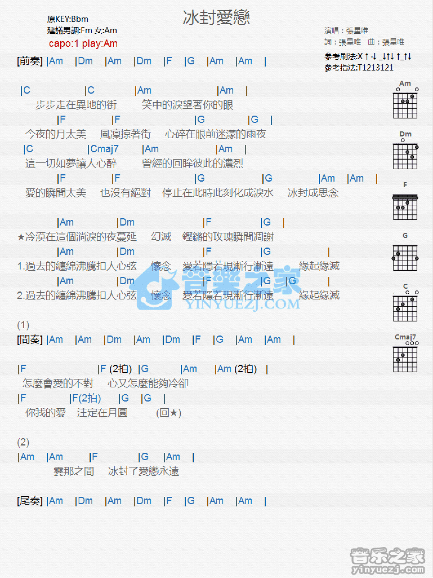 曲谱介绍: Am调版张星唯《冰封爱恋》吉他和弦弹唱谱