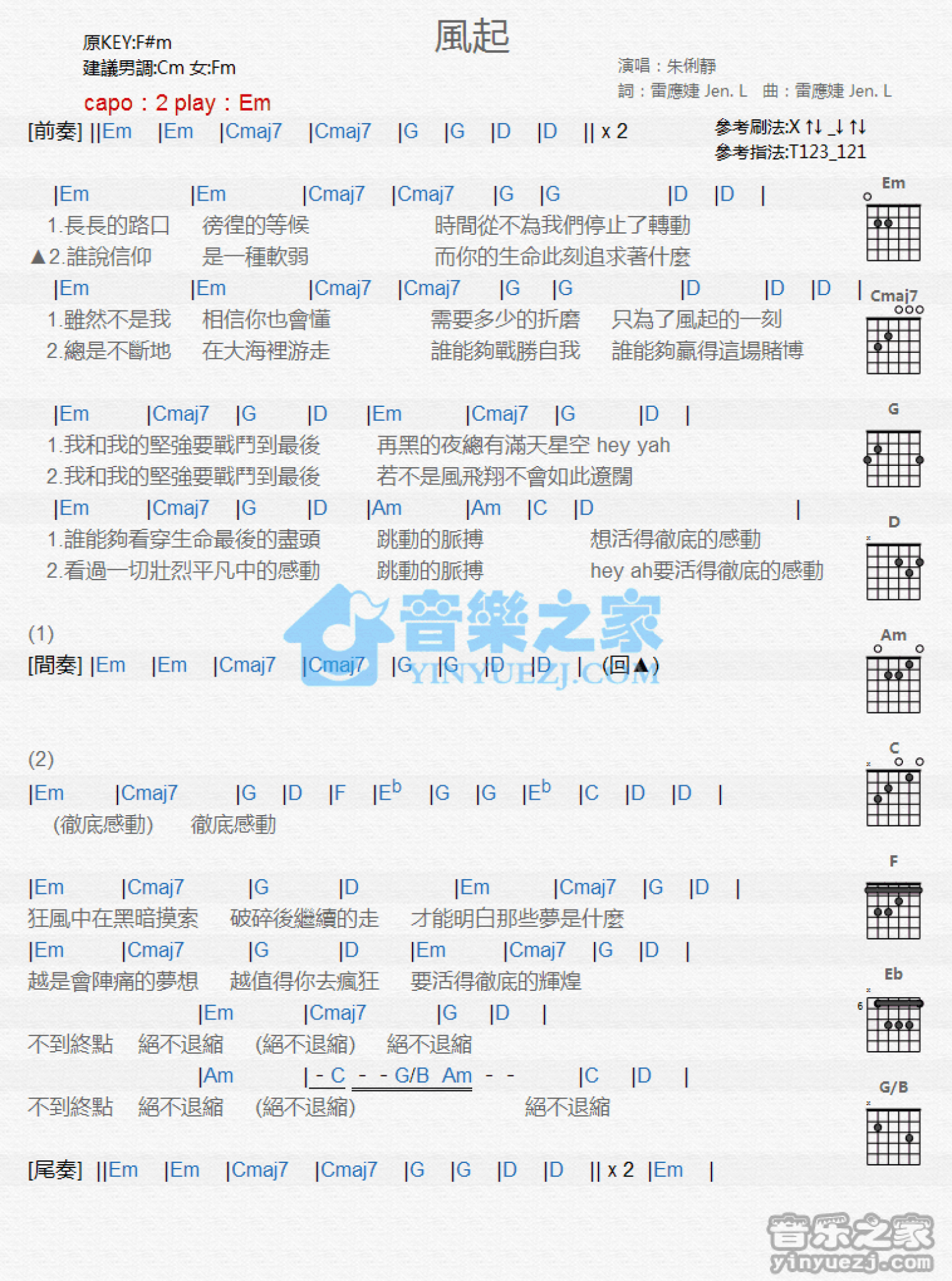 曲谱介绍: Em调版朱俐静《风起》吉他和弦弹唱谱