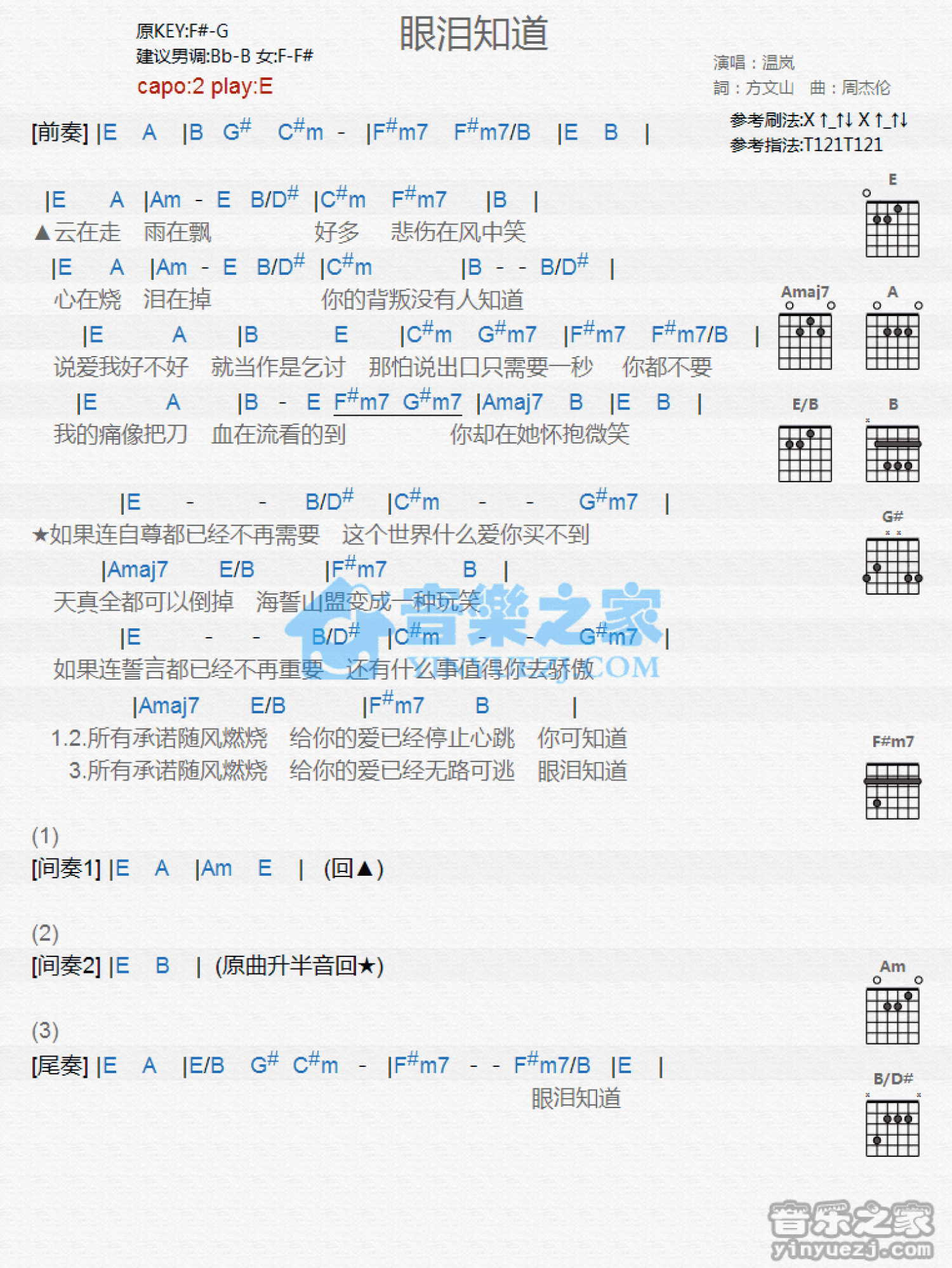 曲谱介绍: E调版温岚《眼泪知道》吉他和弦弹唱谱