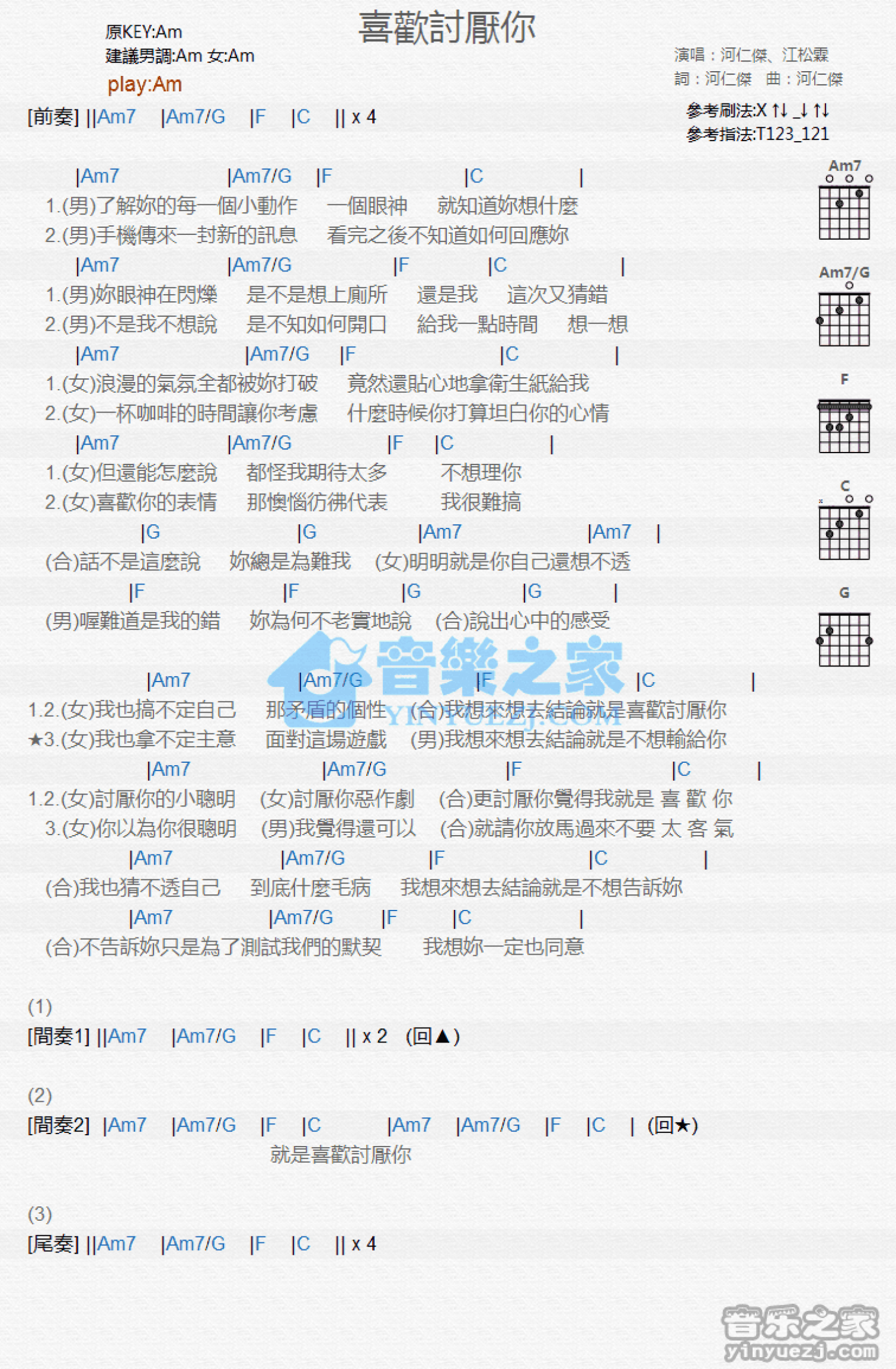 曲谱介绍: Am调版河仁杰/江松霖《喜欢讨厌你》吉他和弦弹唱谱
