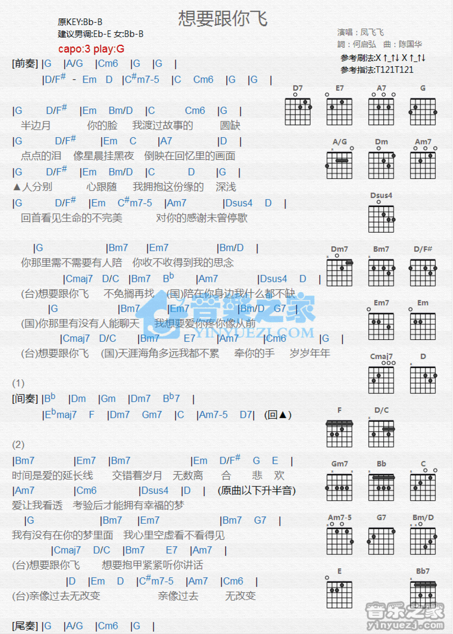 曲谱介绍: G调版凤飞飞《想要跟你飞》吉他和弦弹唱