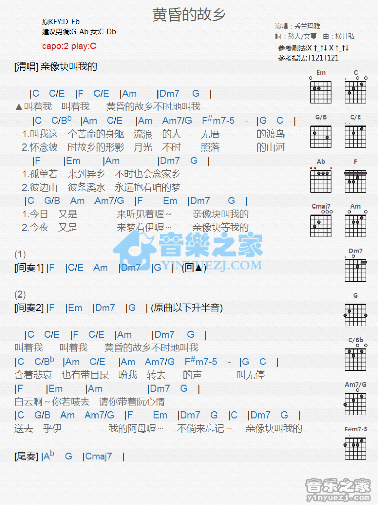 曲谱介绍: C调版 秀兰玛雅《黄昏的故乡》吉他和弦弹唱谱
