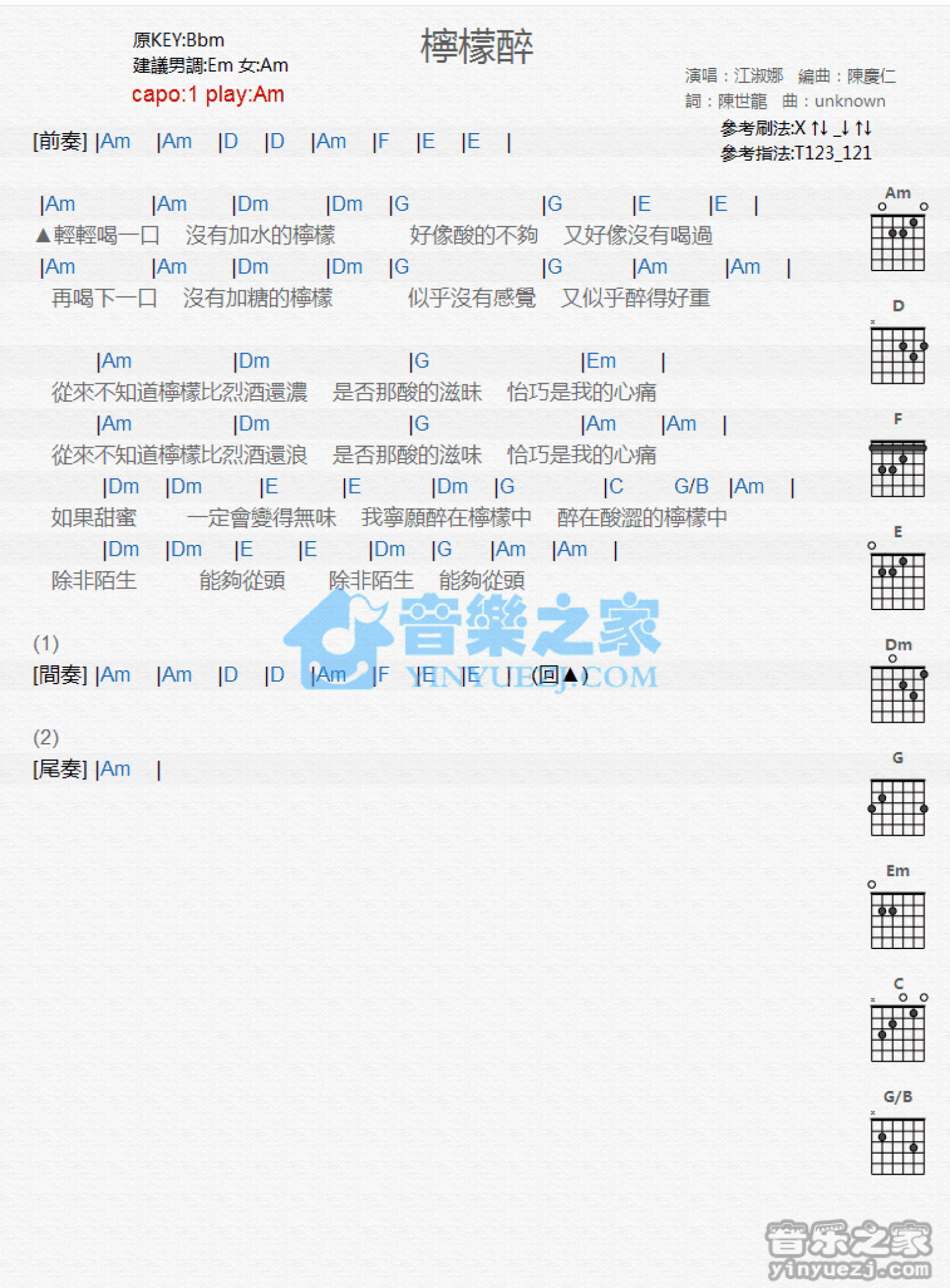 曲谱介绍: Am调版江淑娜《柠檬醉》吉他和弦弹唱谱