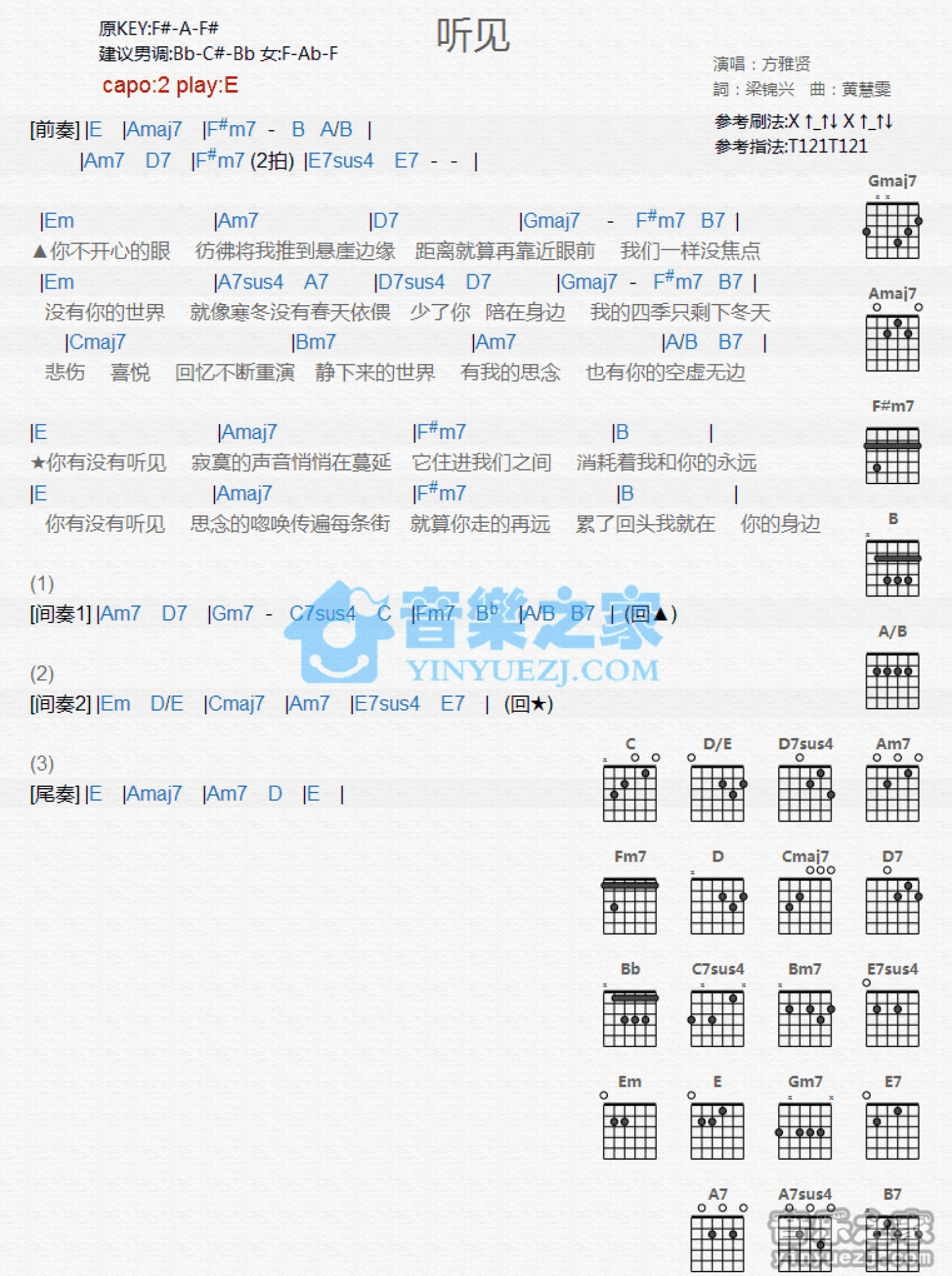 曲谱介绍: E调版方雅贤《听见》吉他和弦弹唱谱