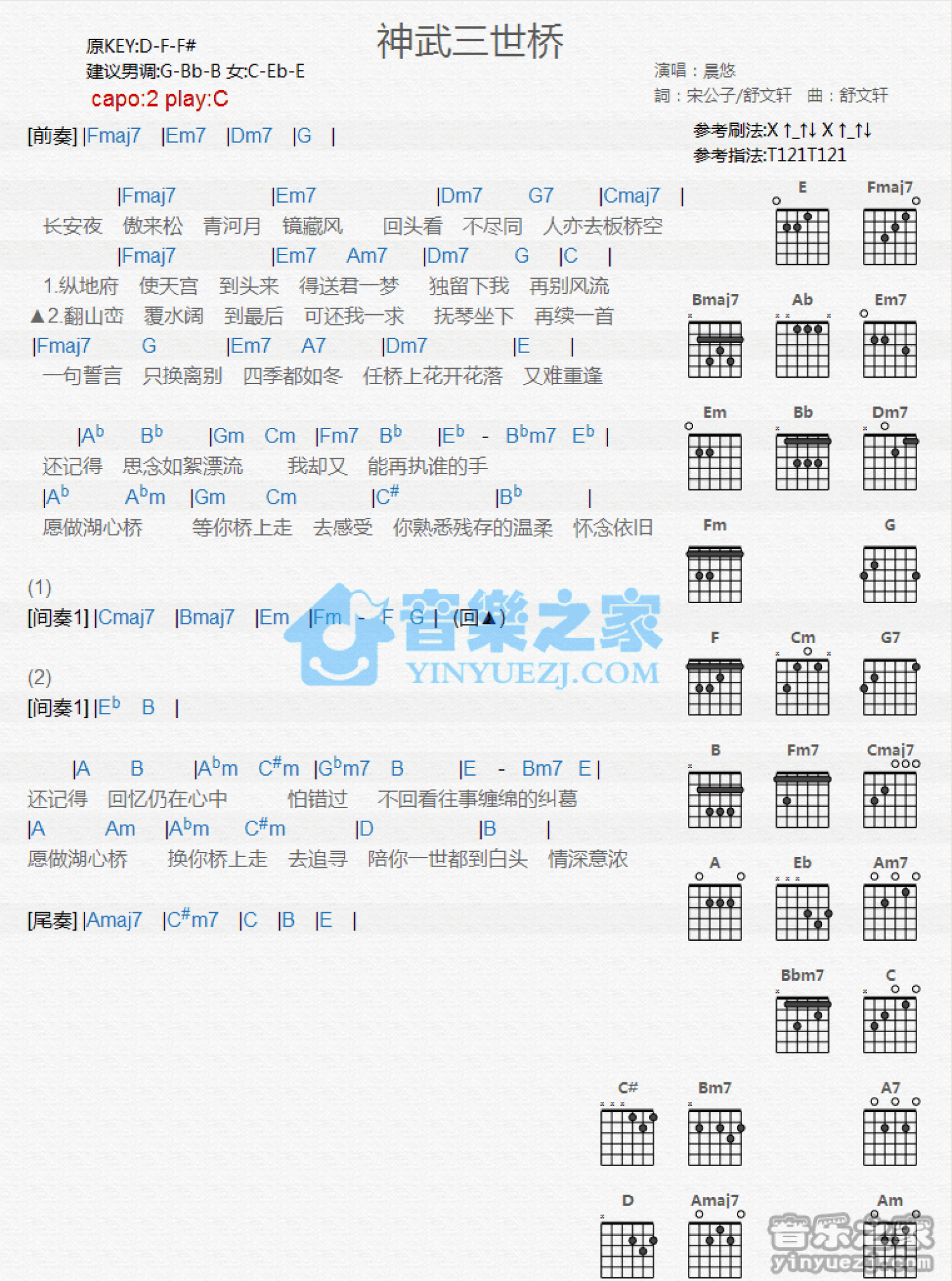 曲谱介绍: C调版晨悠《神武三世桥》吉他和弦弹唱谱