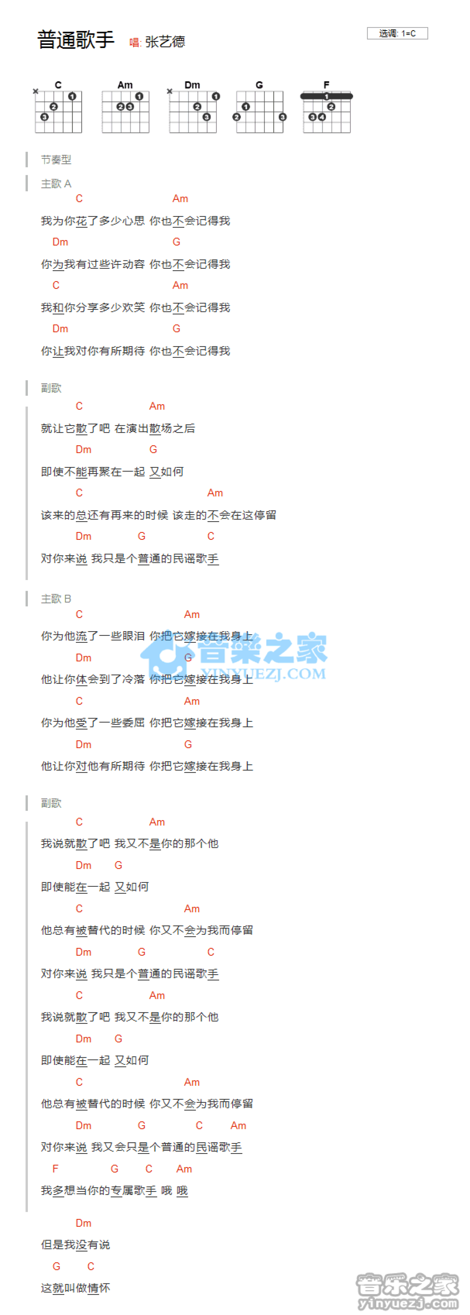 曲谱介绍: C调版张艺德《普通歌手》吉他和弦弹唱谱