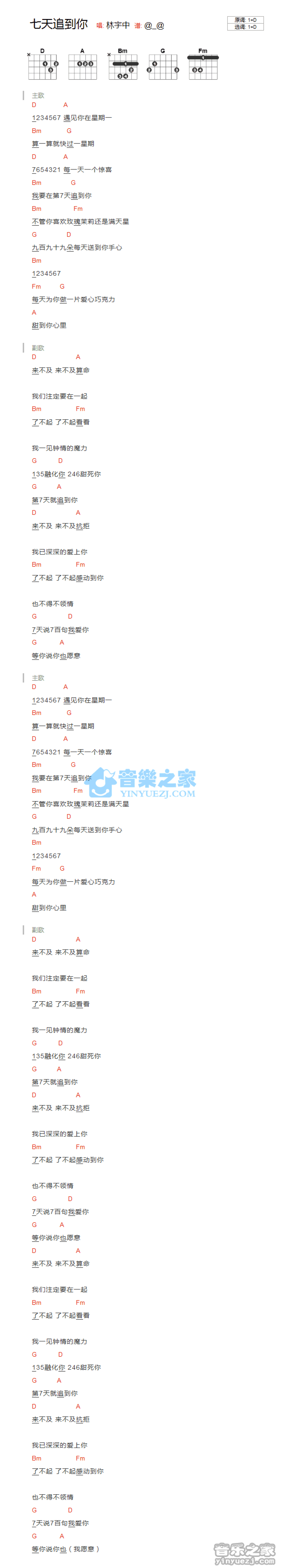 曲谱介绍: D调版林宇中《七天追到你》吉他和弦弹唱谱