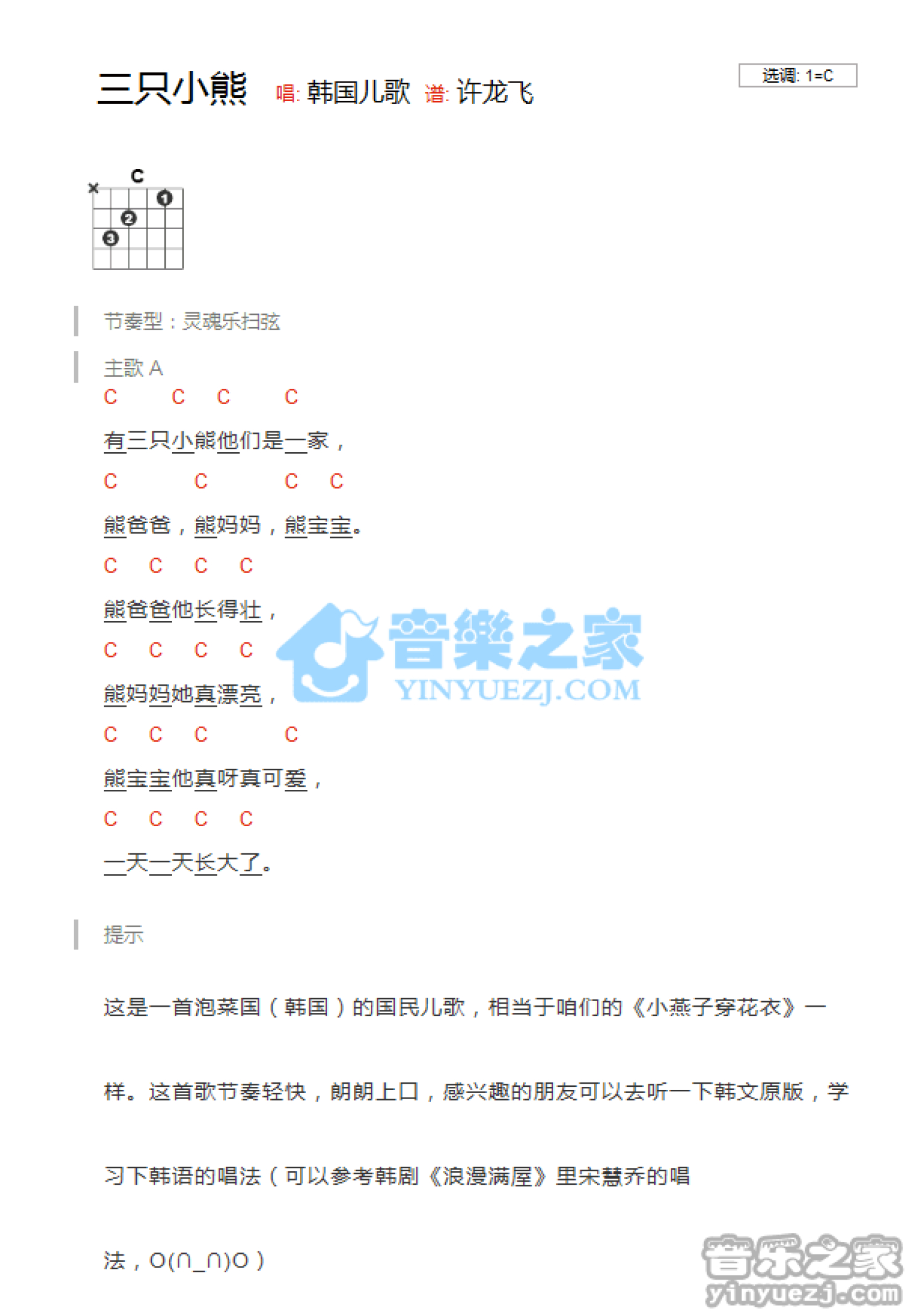 曲谱介绍: C调版《三只小熊》吉他和弦弹唱谱