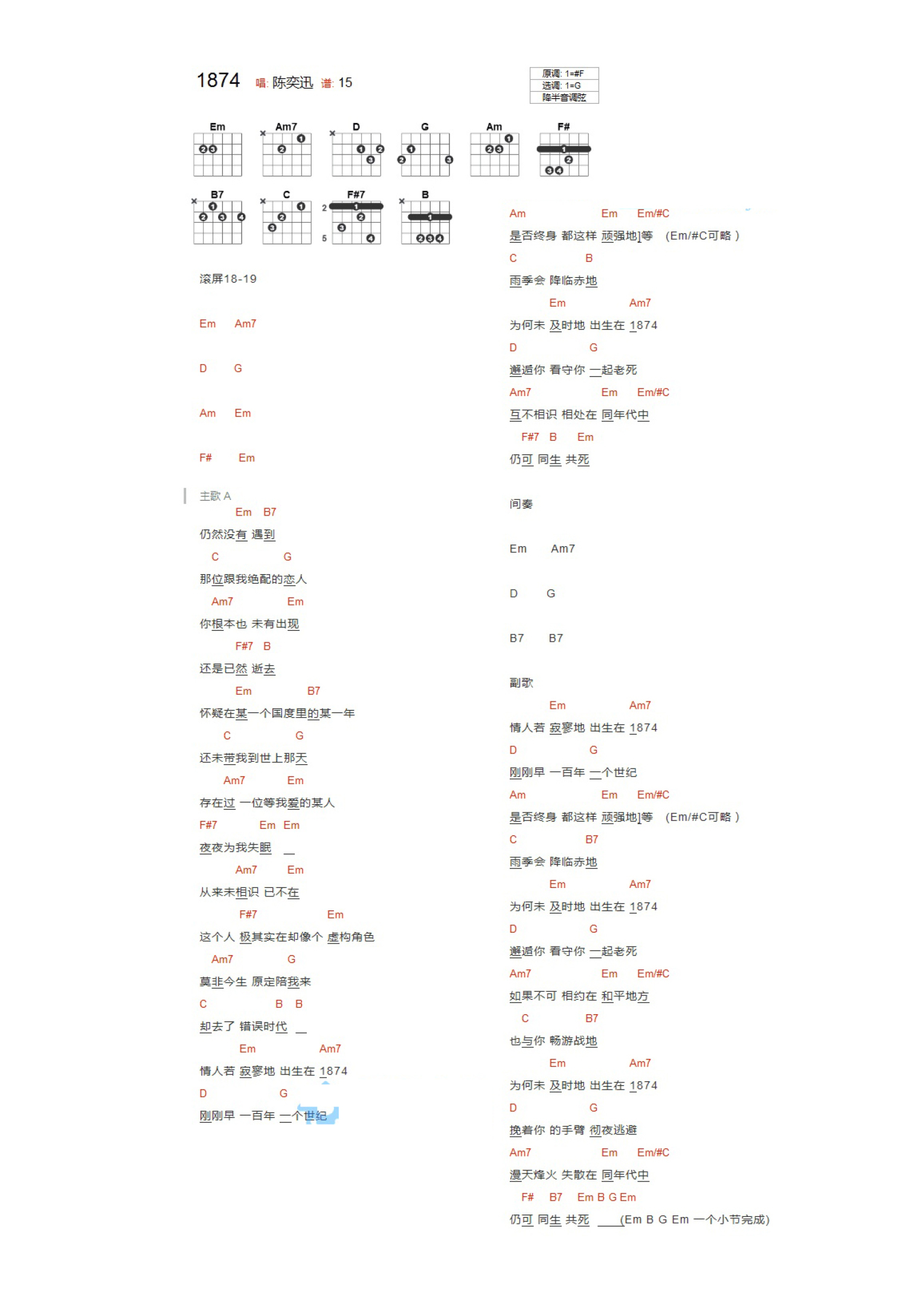 曲谱介绍: G调版陈奕迅《1874》吉他和弦弹唱谱