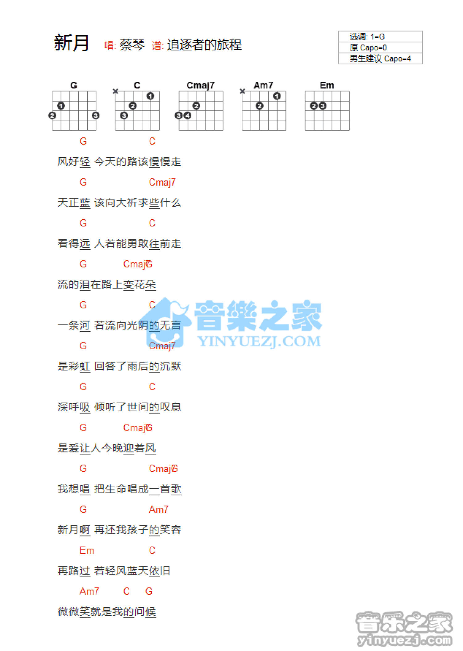 曲谱介绍: G调版蔡琴《新月》吉他和弦弹唱谱