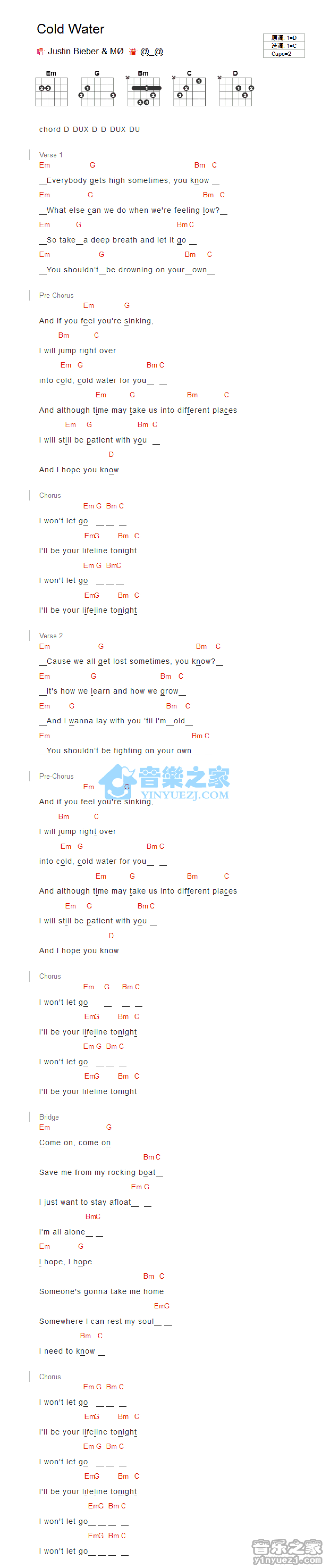 曲谱介绍: C调版《ColdWater》吉他和弦弹唱谱