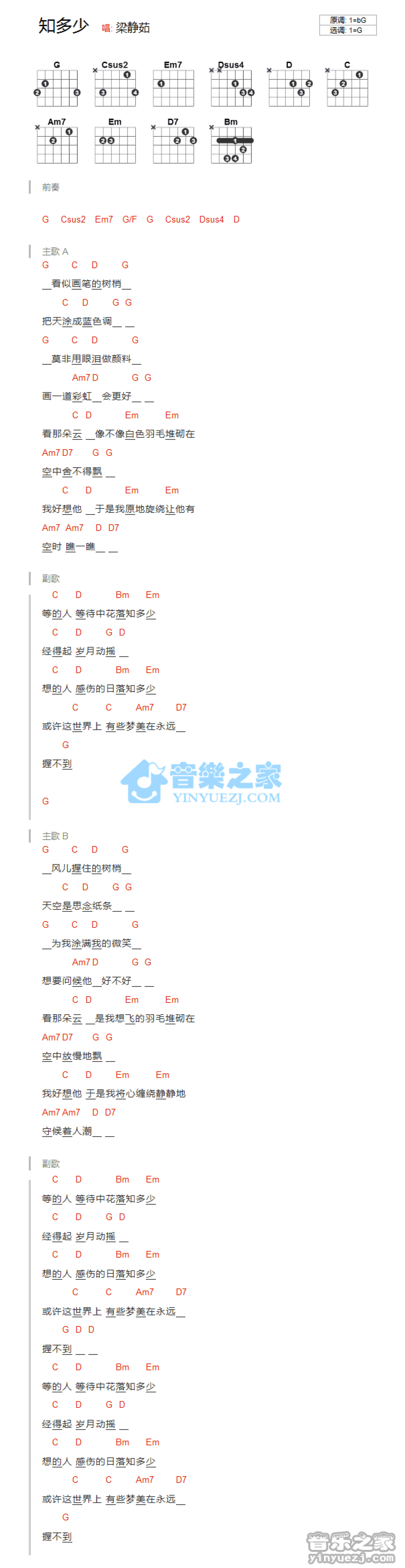曲谱介绍: G调版梁静茹《知多少》吉他和弦弹唱谱