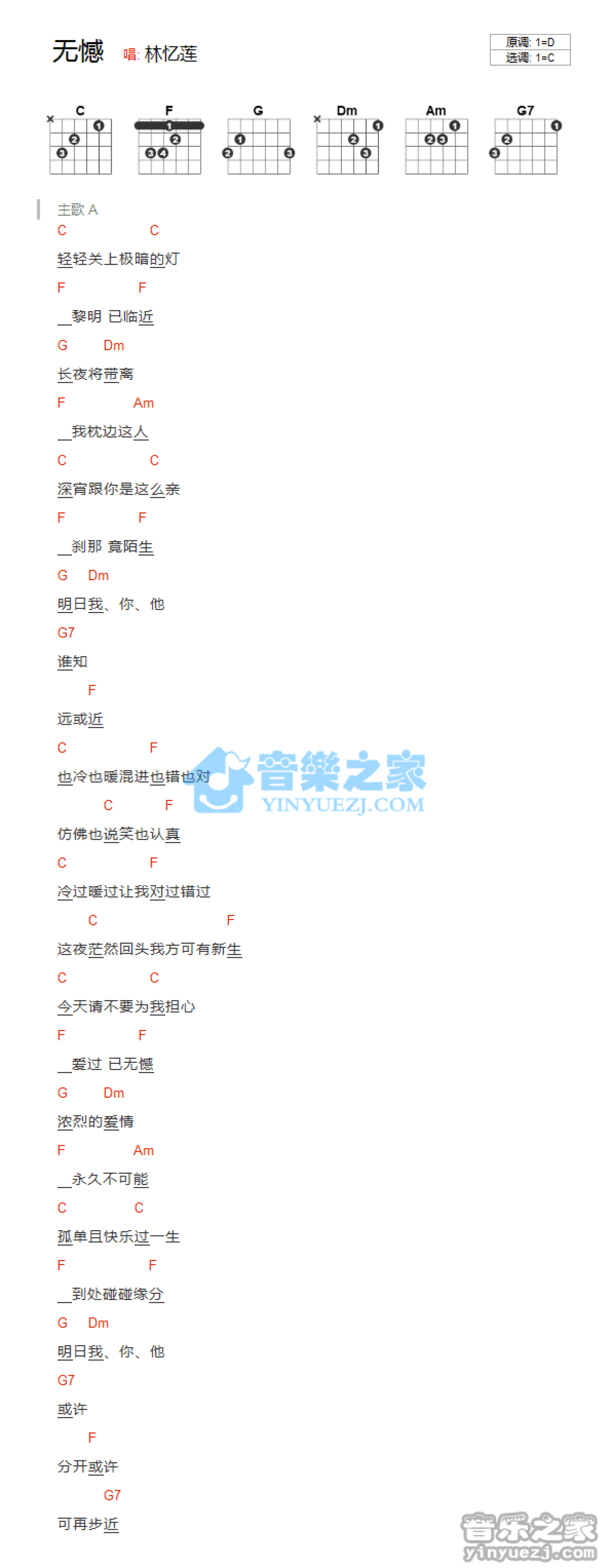 曲谱介绍: C调版林忆莲《无憾》吉他和弦弹唱谱