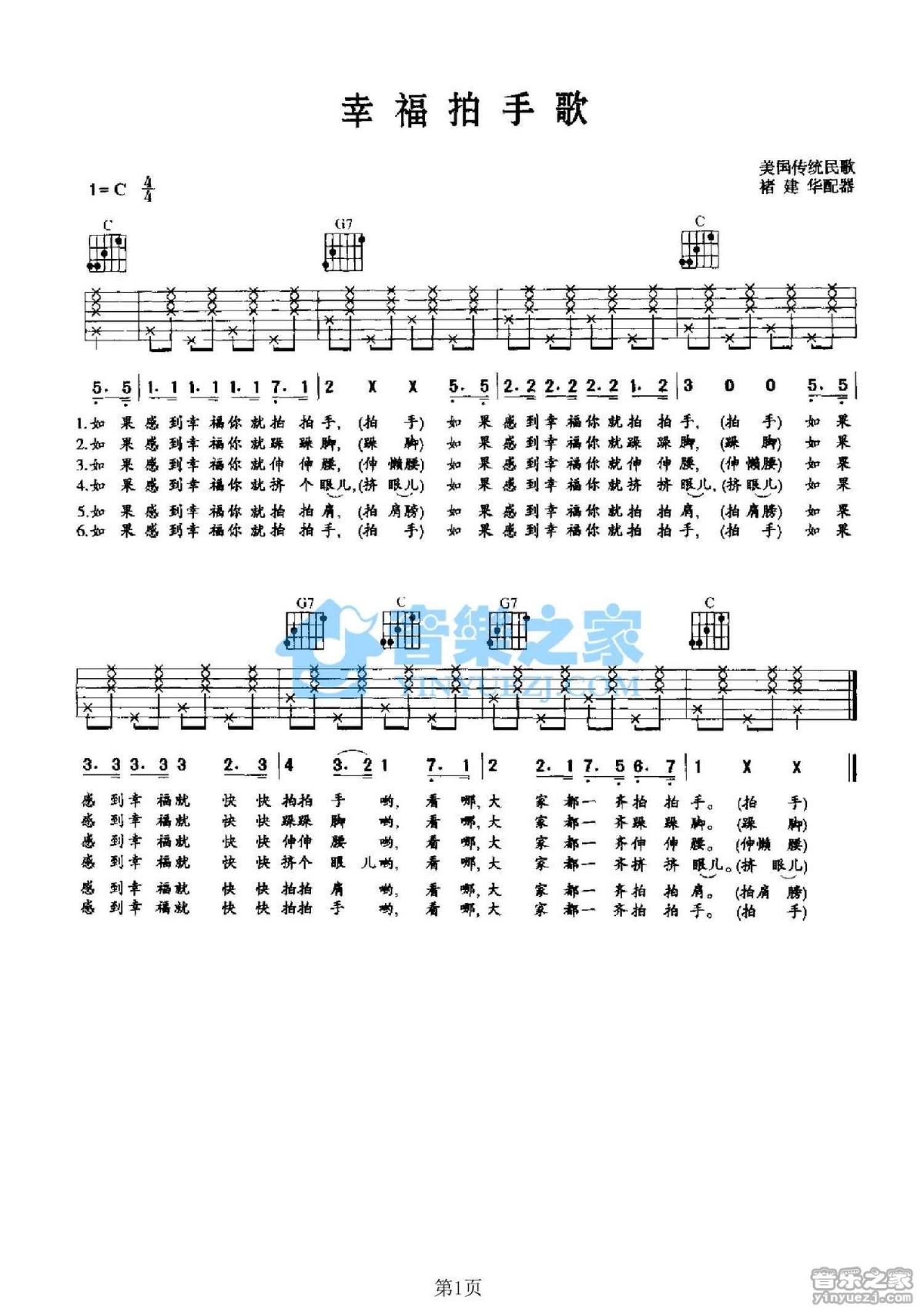曲谱介绍: C调版西班牙儿童歌曲《幸福拍手歌》吉他弹唱六线谱