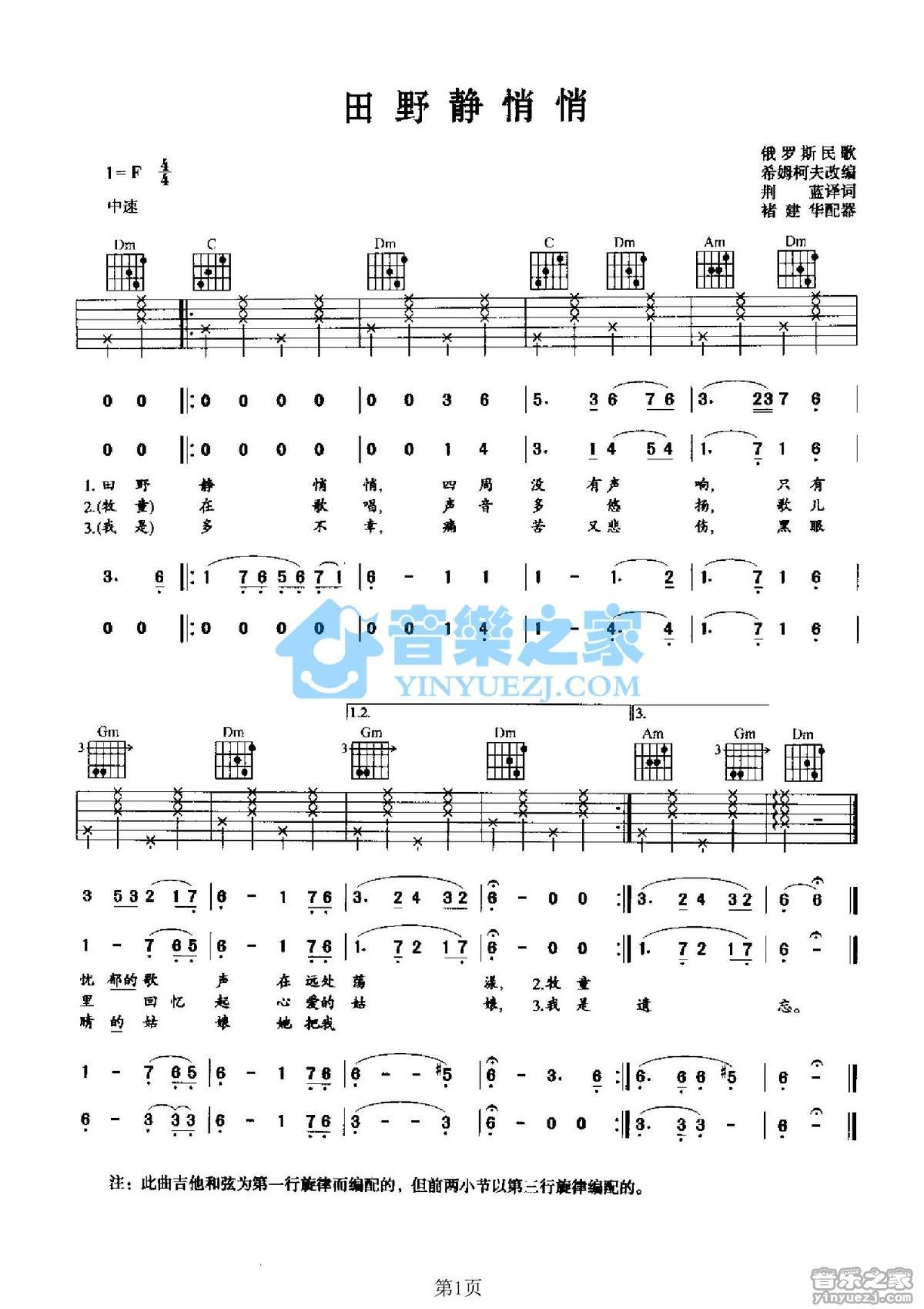 曲谱介绍: F调版 俄罗斯民歌《田野静悄悄》吉他弹唱六线谱