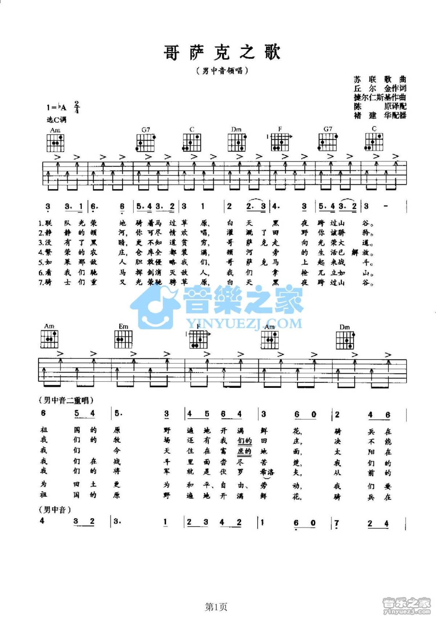 曲谱介绍: C调版苏联歌曲《哥萨克之歌》吉他弹唱六线谱