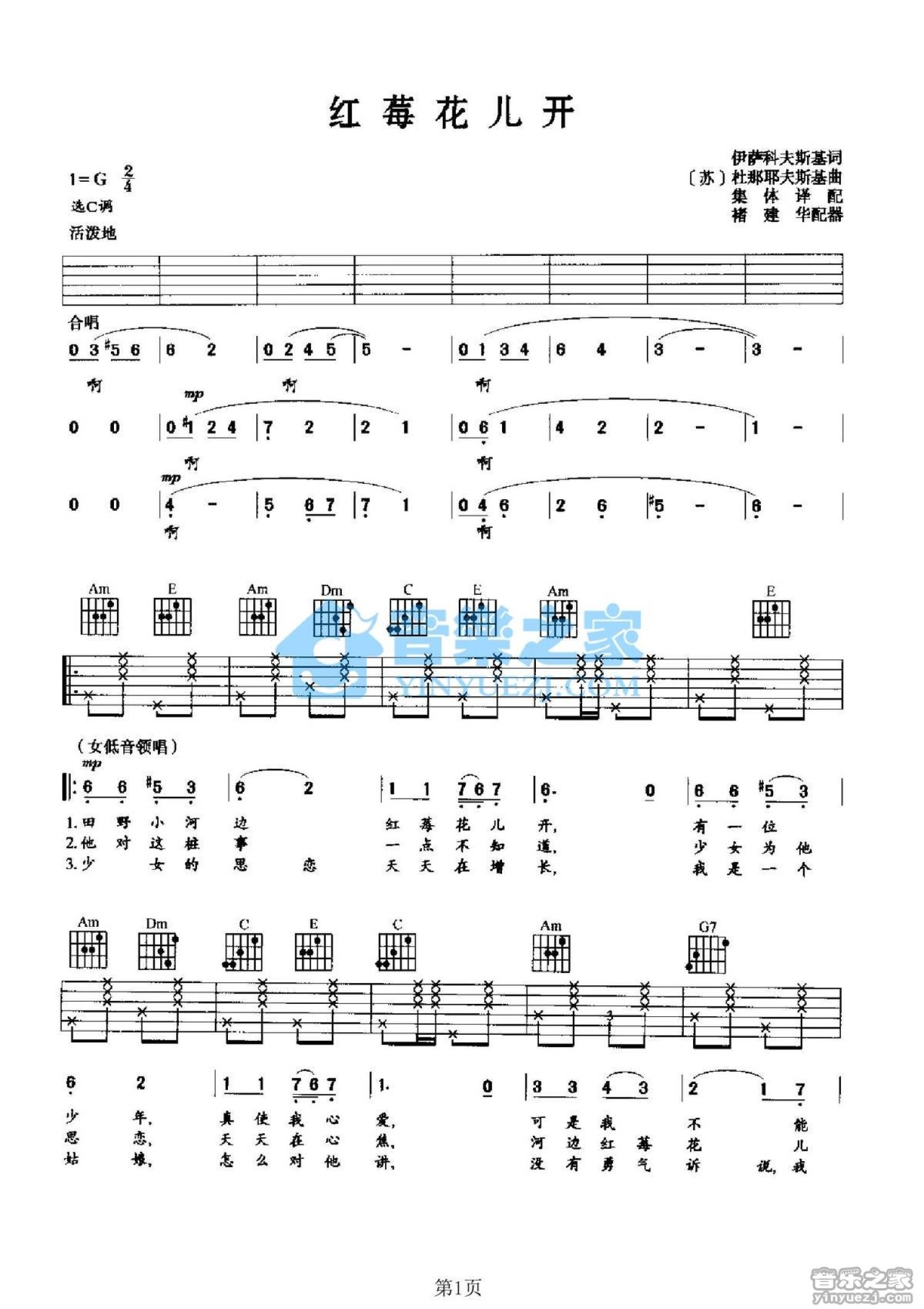 曲谱介绍: C调版俄国歌曲《红莓花儿开》吉他弹唱六线谱