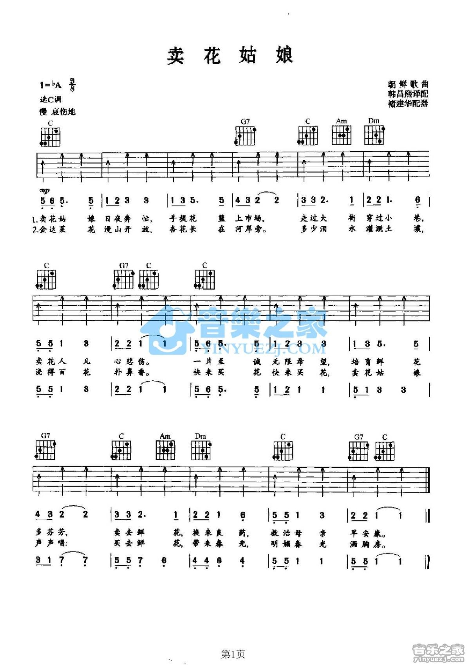 曲谱介绍: C调版朝鲜歌曲《卖花姑娘》吉他弹唱六线谱