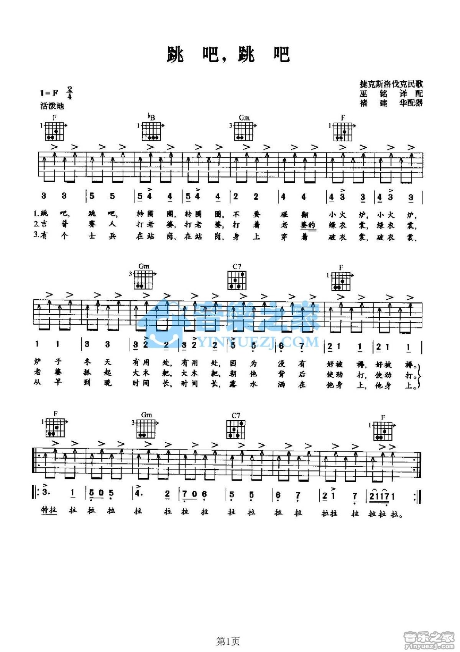 曲谱介绍: F调版捷克民歌《跳吧跳吧》吉他弹唱六线谱