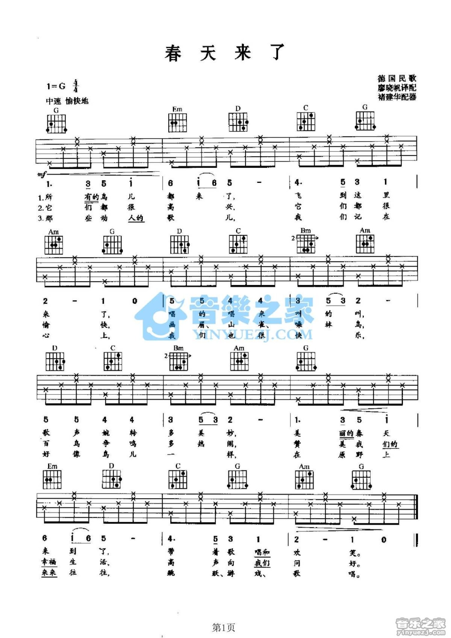 曲谱介绍: G调版《春天来了》吉他弹唱六线谱