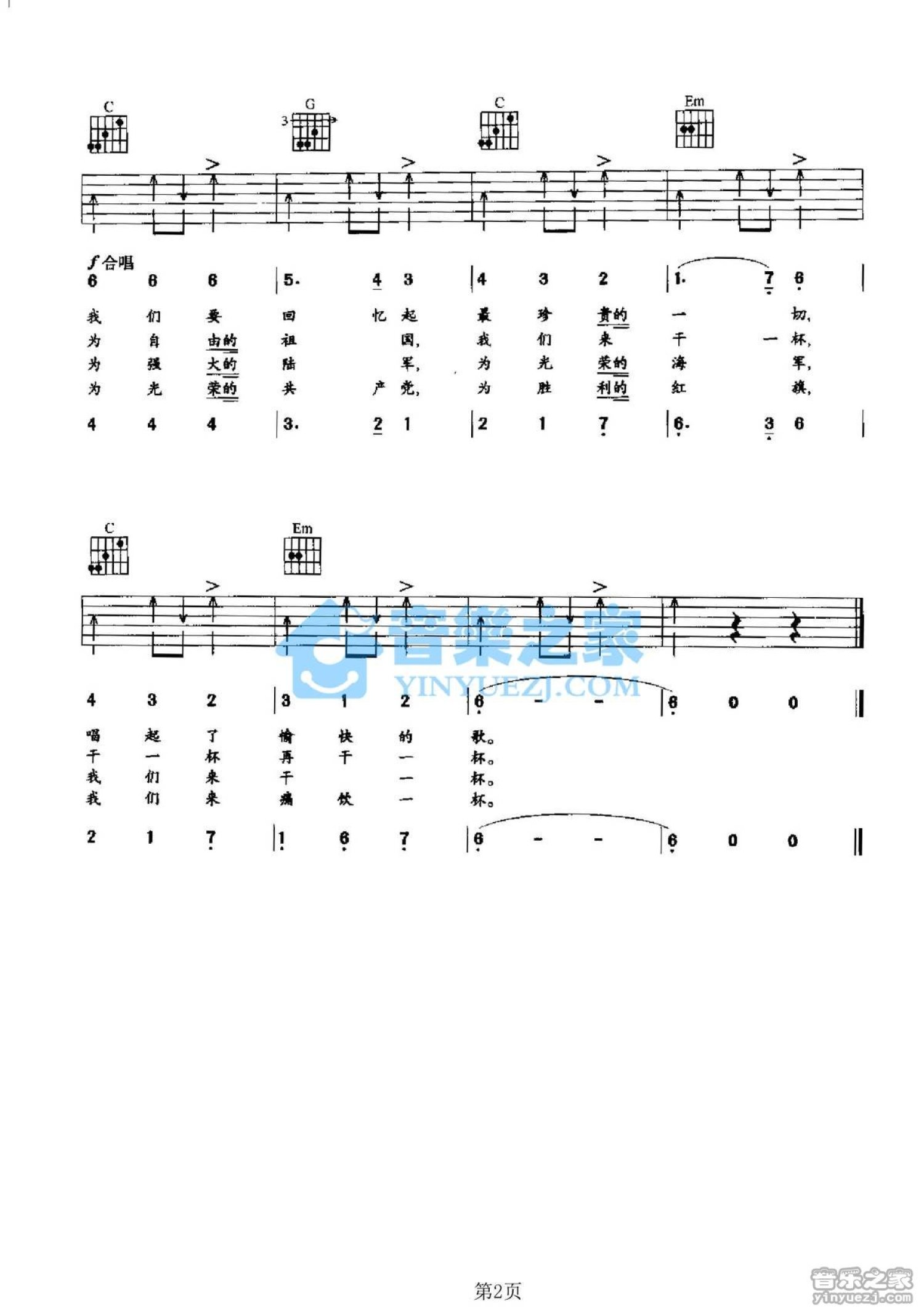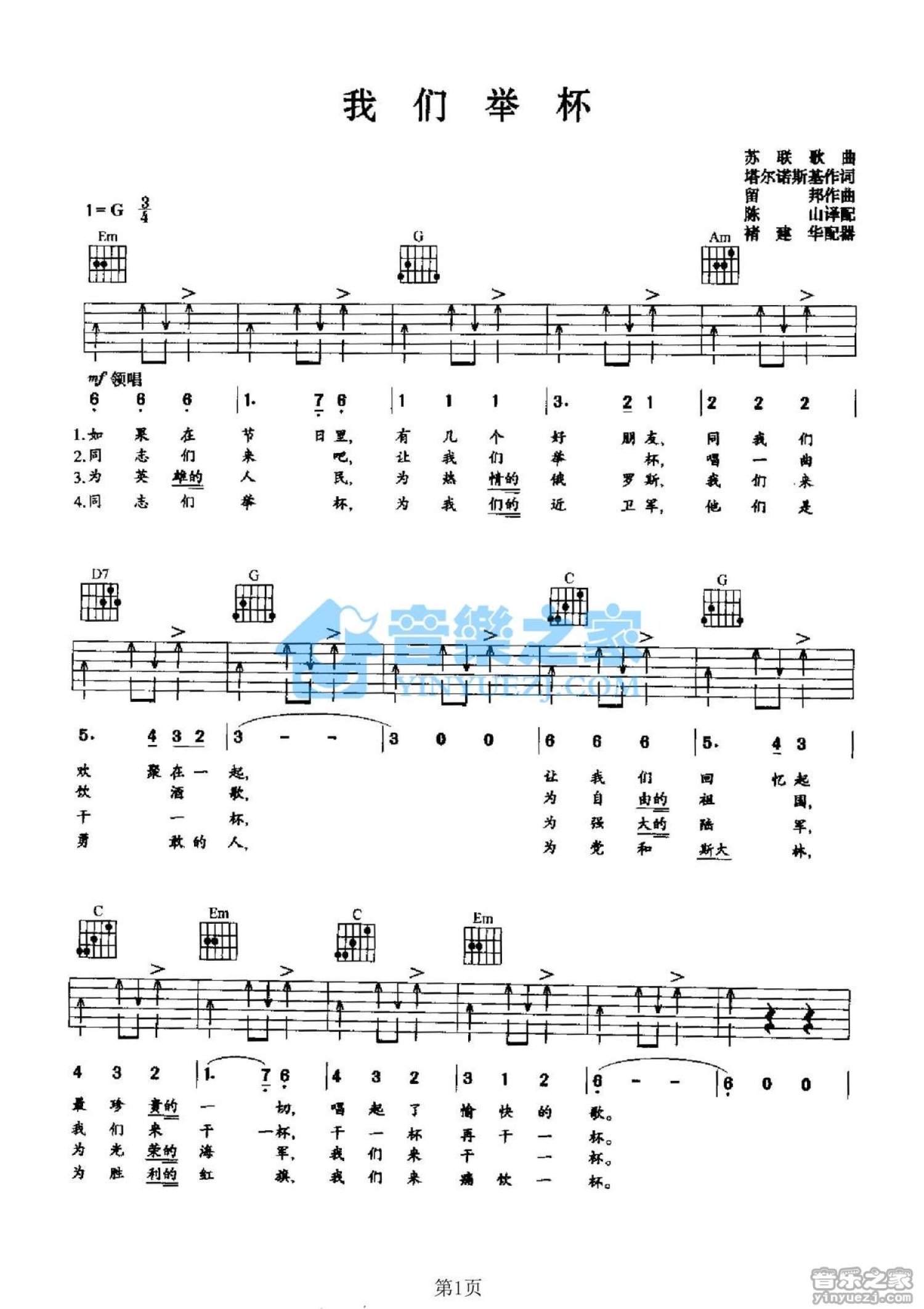 曲谱介绍: G调版苏联歌曲《我们举杯》吉他弹唱六线谱