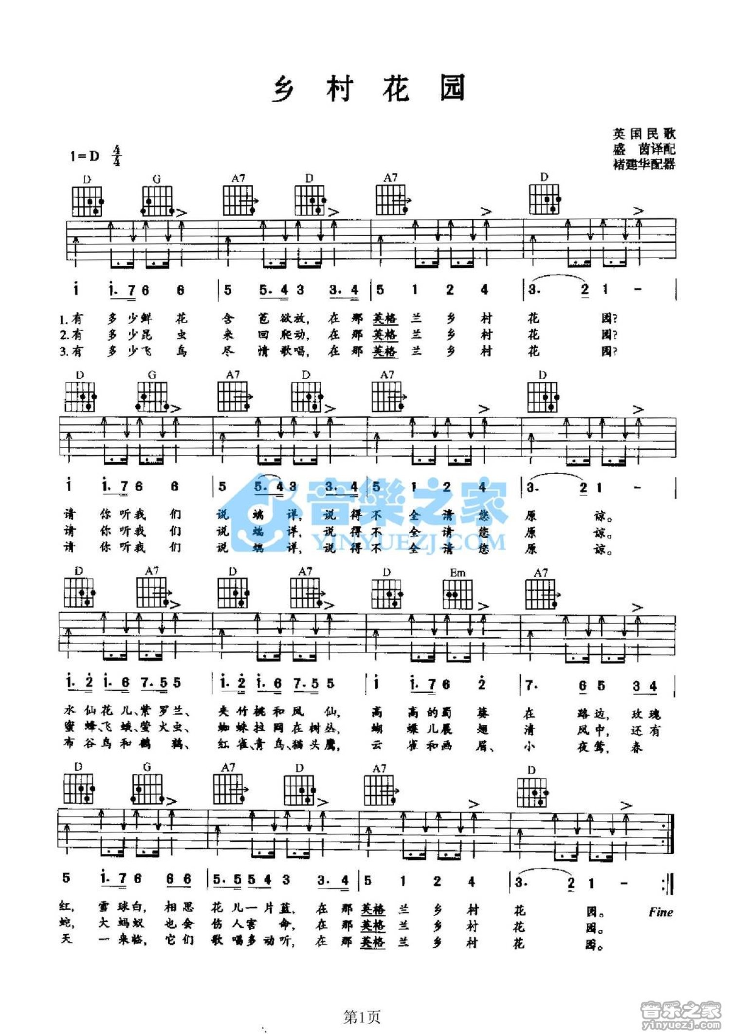 曲谱介绍: D调版英国民歌《乡村花园》吉他弹唱六线谱