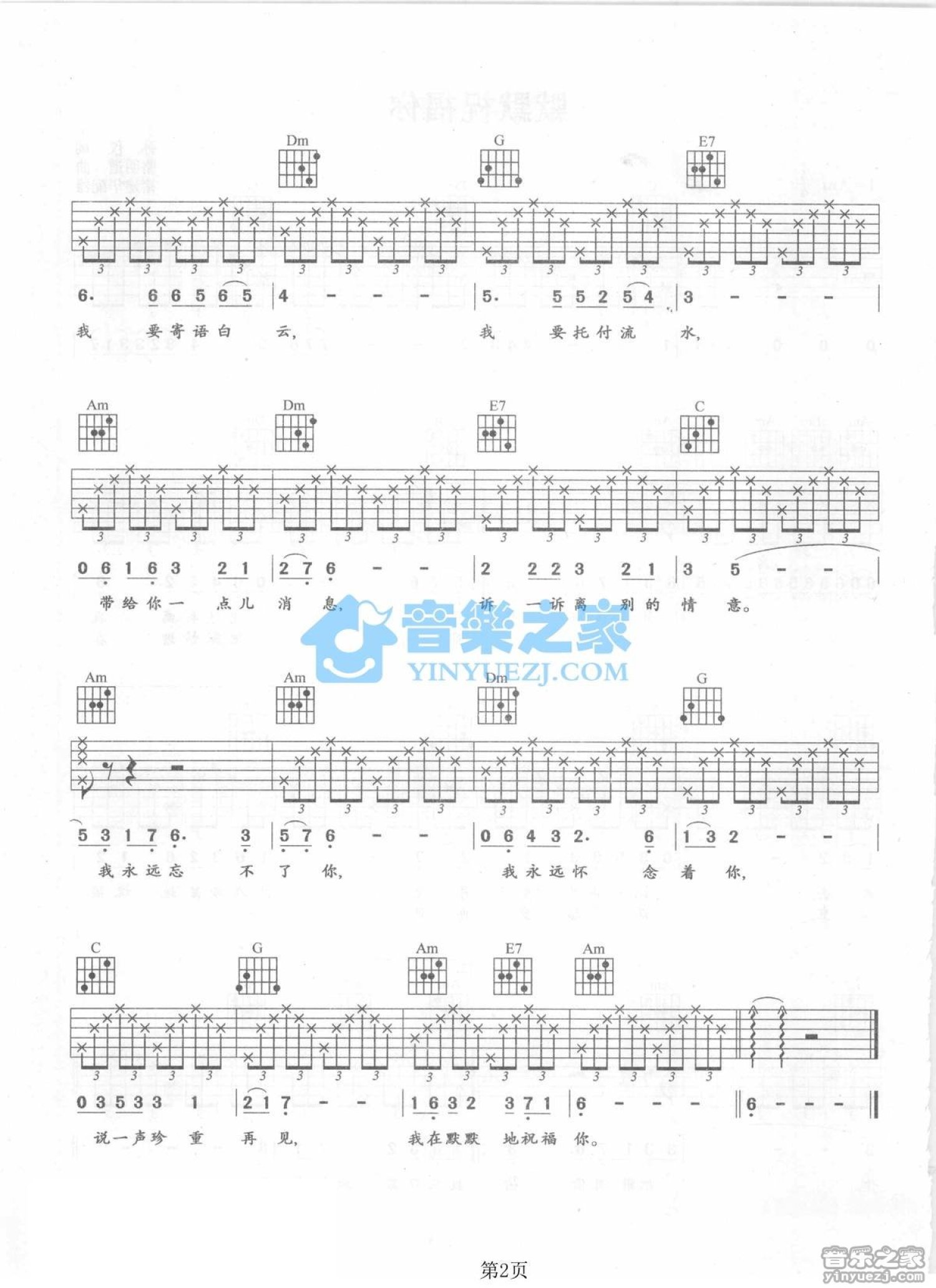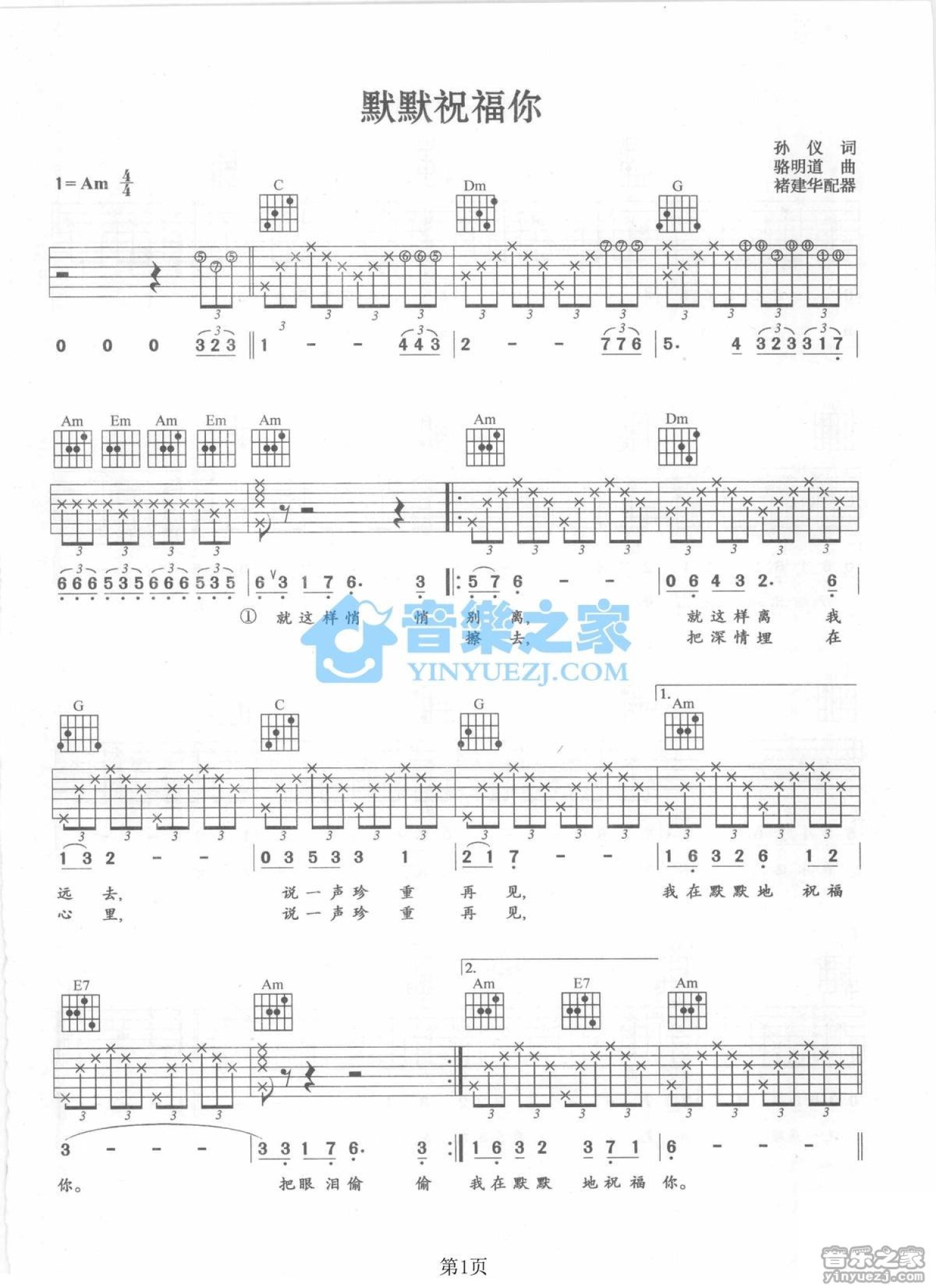 曲谱介绍: Am调版梁佳玉《默默祝福你》吉他弹唱六线谱