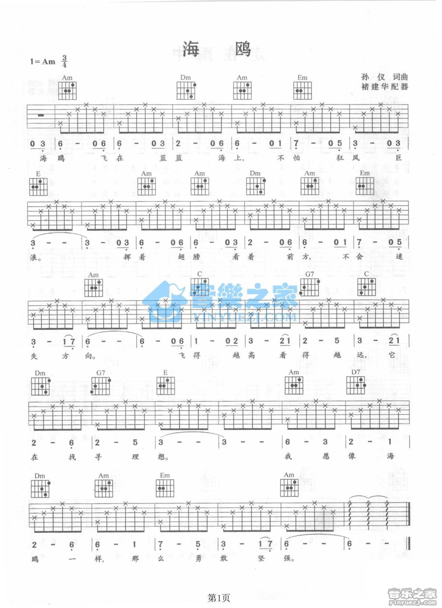 曲谱介绍: Am调版蔡琴《海鸥》吉他弹唱六线谱