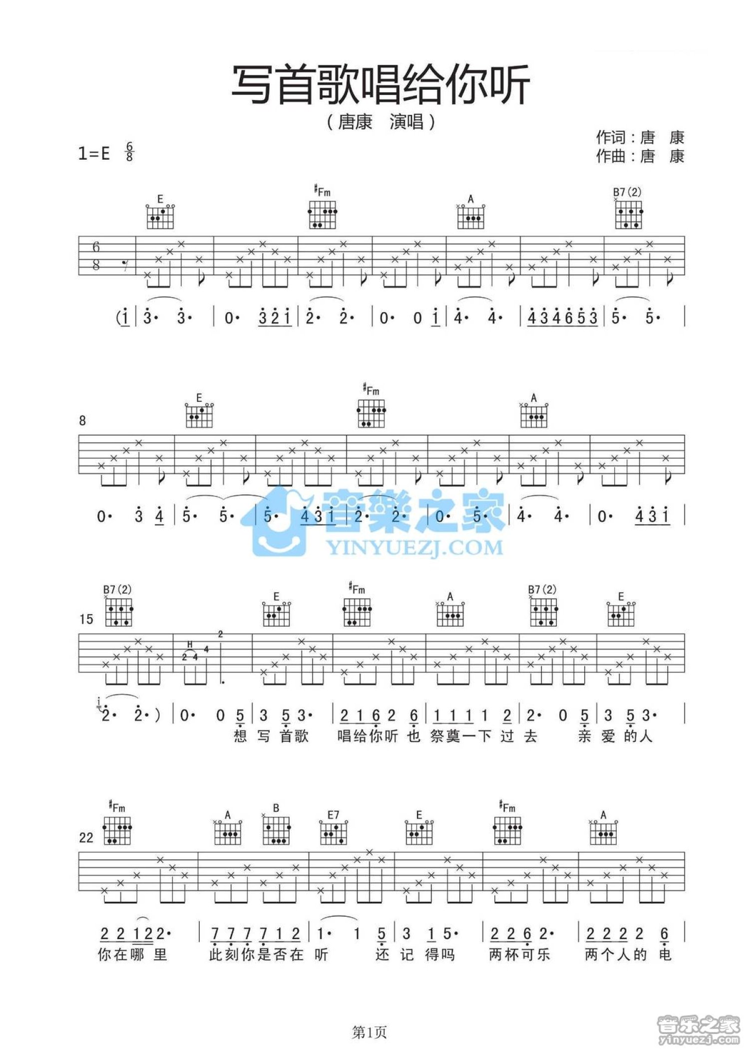 曲谱介绍: 丽江酒吧E调原版丽江康康《写首歌唱给你听》吉他弹唱六线谱