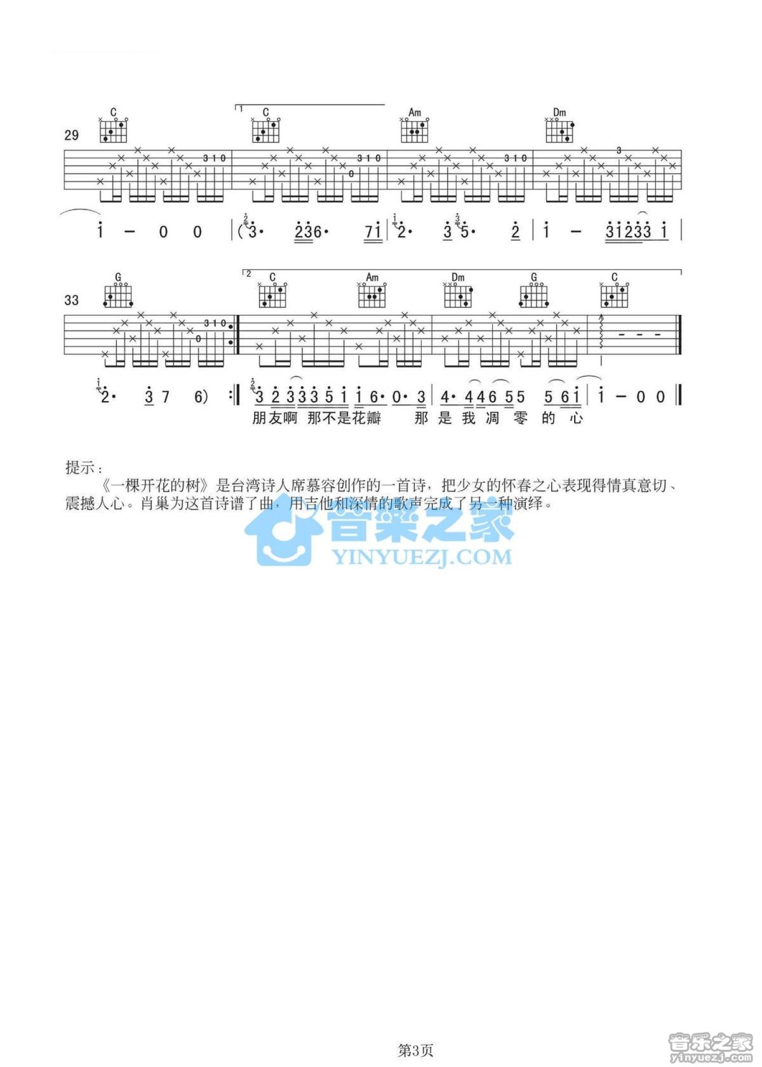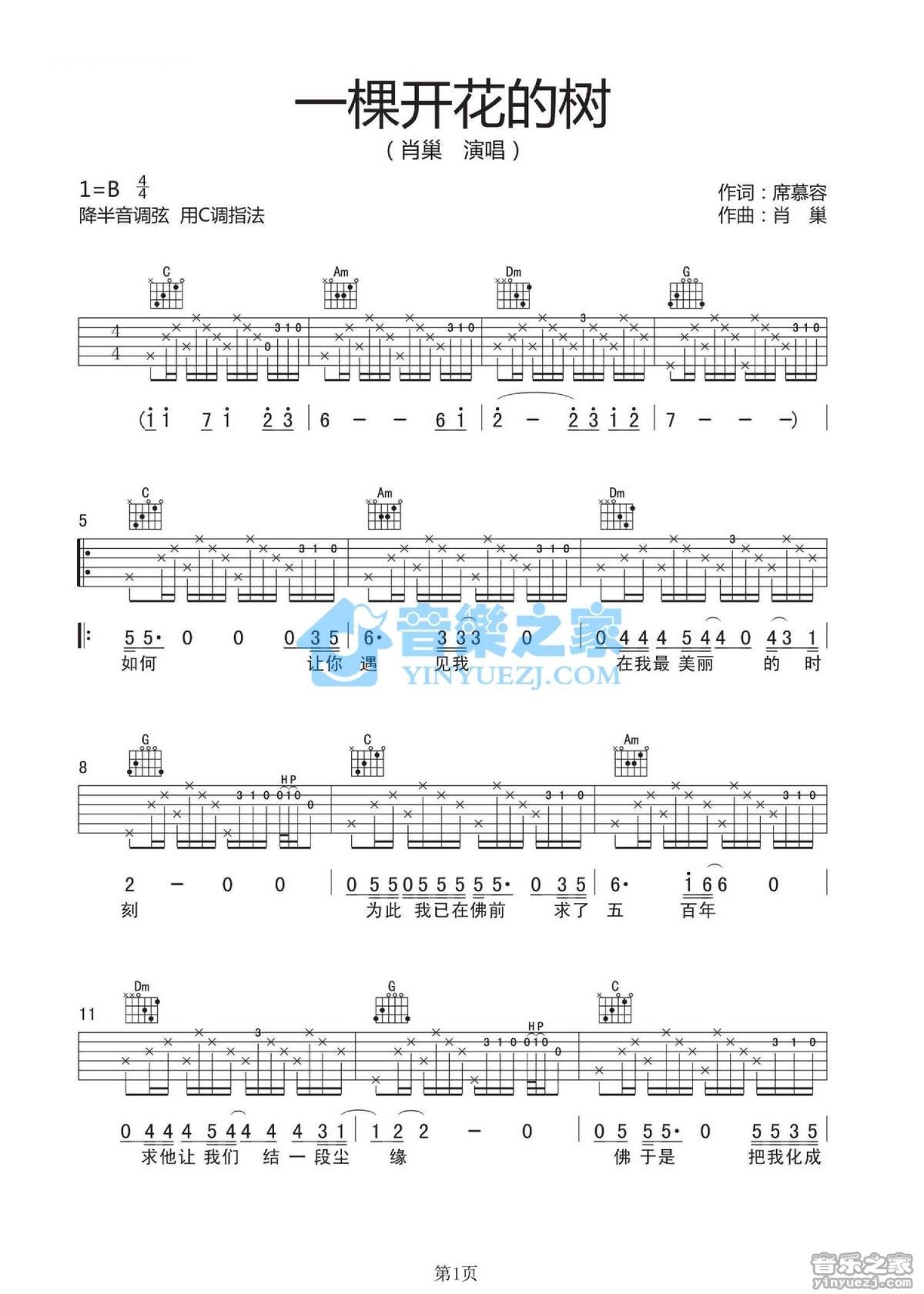 曲谱介绍: 丽江酒吧C调原版肖巢《一棵开花的树》吉他弹唱六线谱