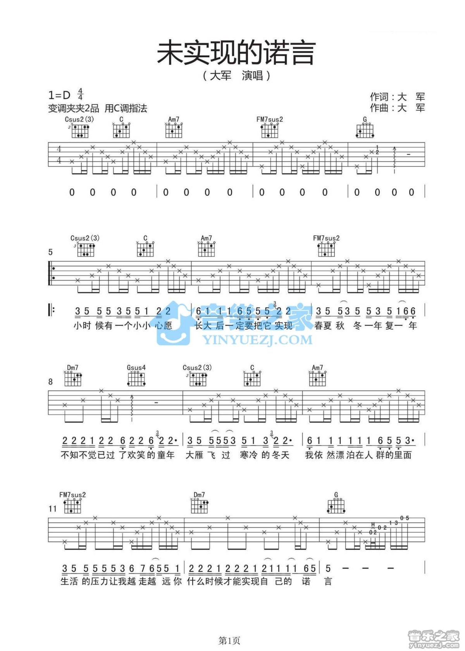 曲谱介绍: 丽江酒吧C调原版大军《未实现的诺言》吉他弹唱六线谱