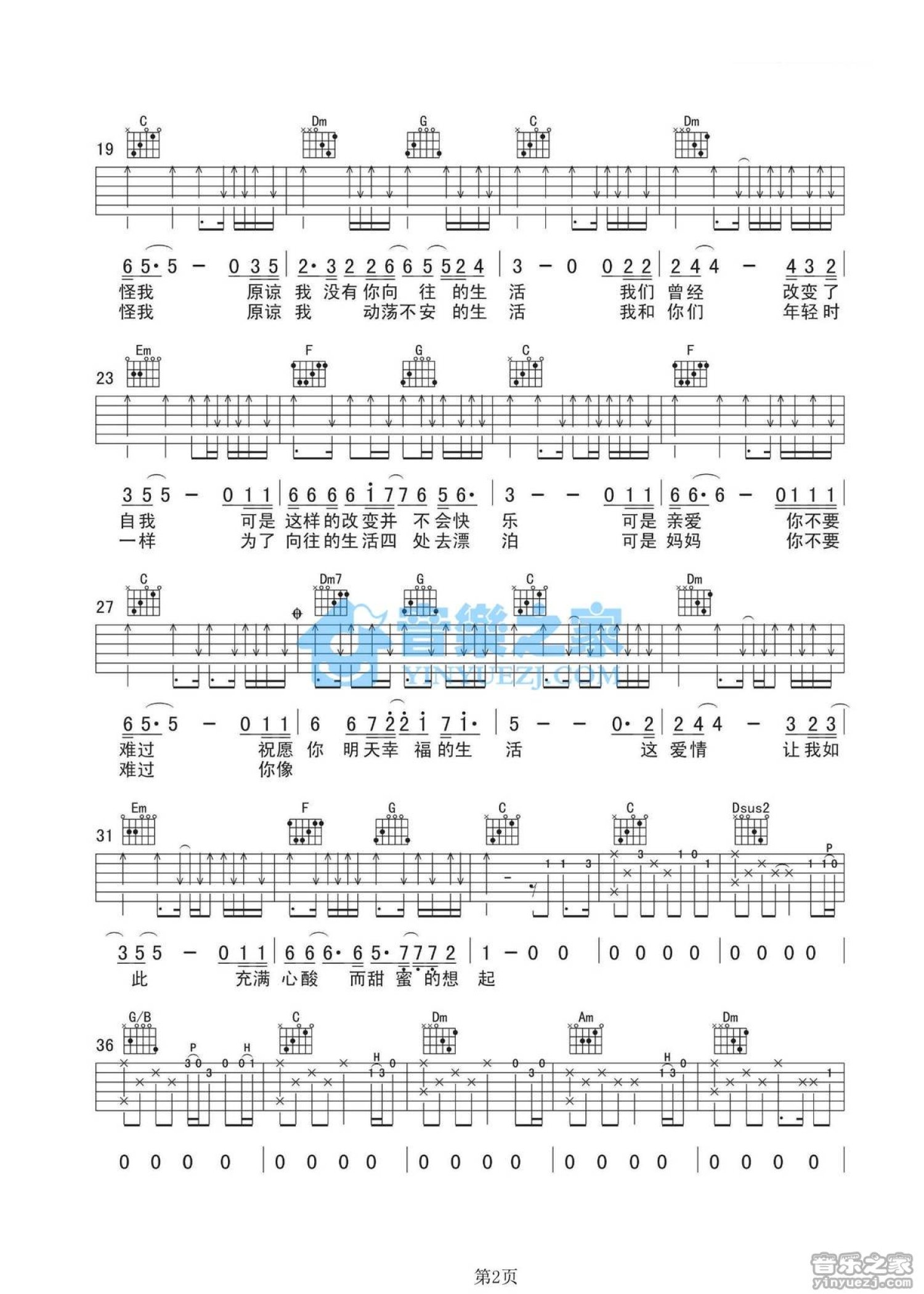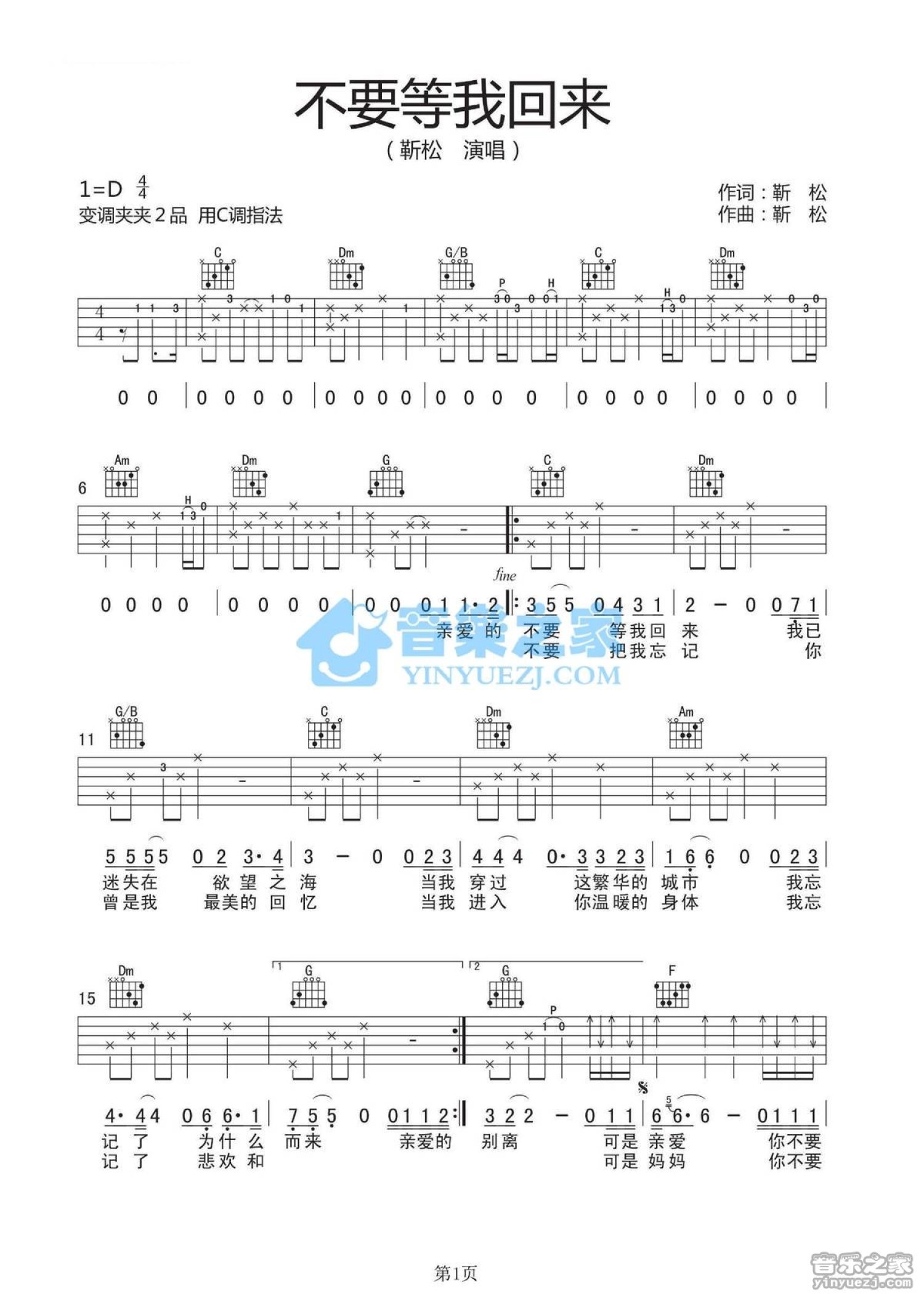 曲谱介绍: 丽江酒吧C调原版靳松《不要等我回来》吉他弹唱六线谱