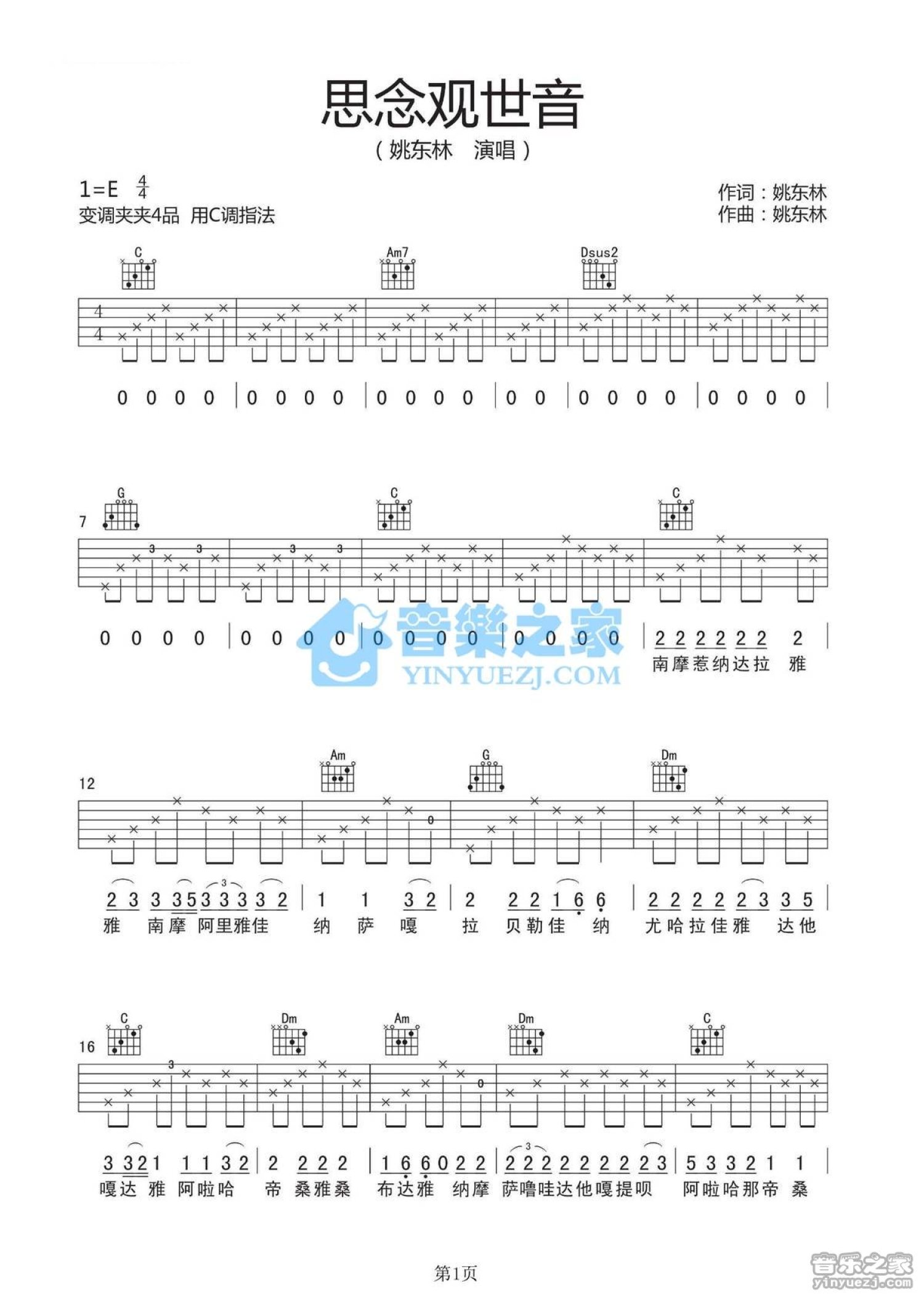 思念观世音吉他谱 - 姚东林 - C调吉他弹唱谱