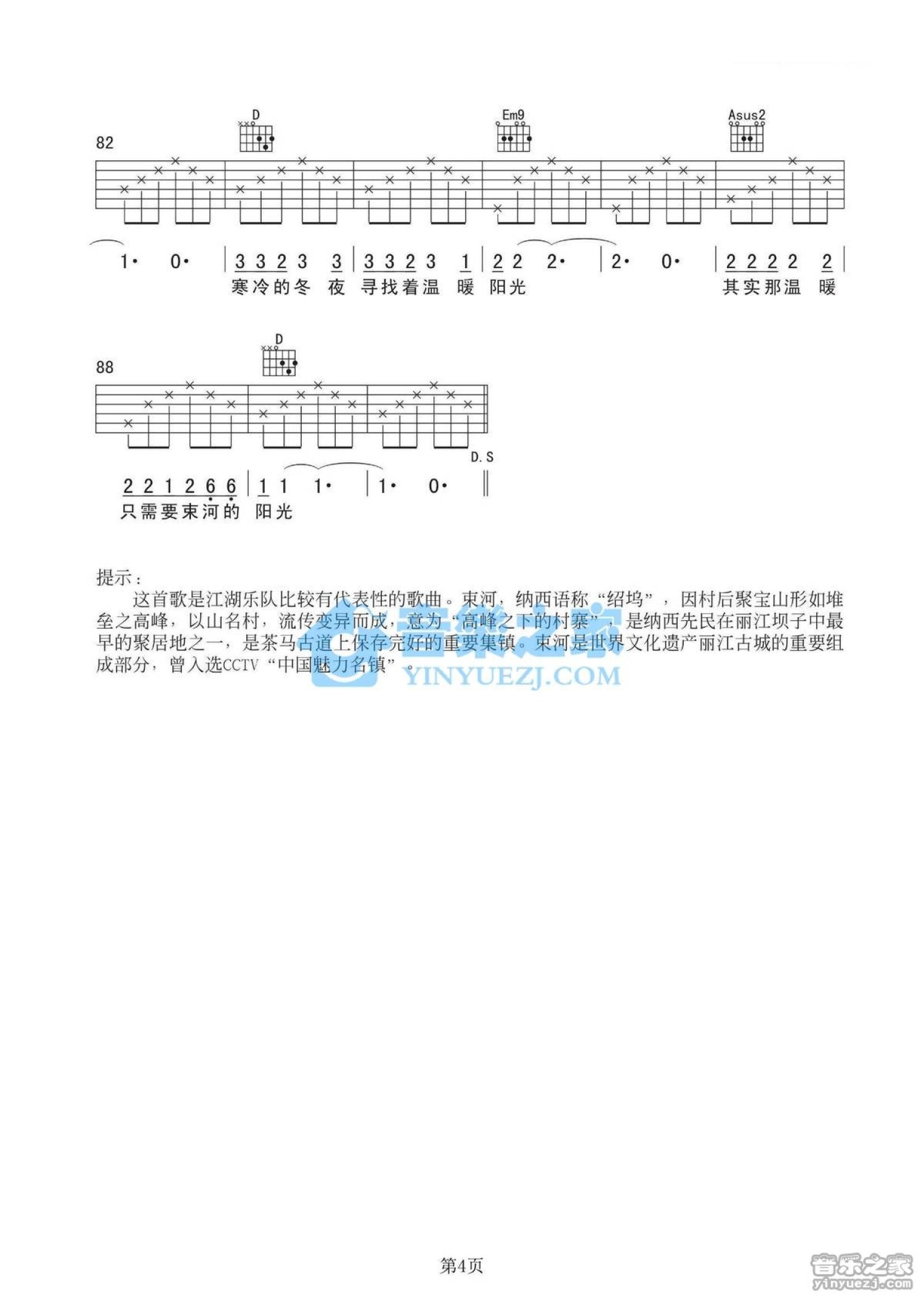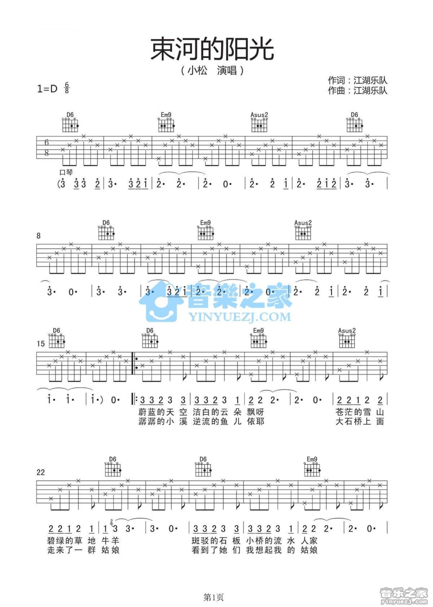 曲谱介绍: 丽江酒吧D调原版小松《束河的阳光》吉他弹唱六线谱