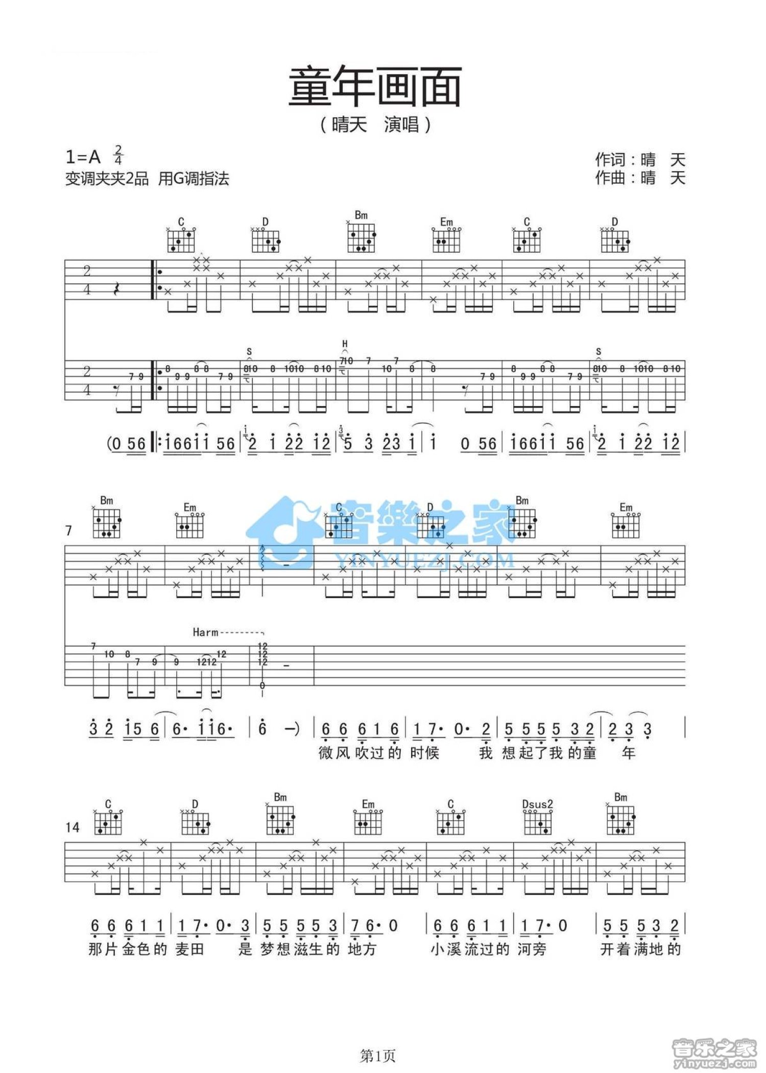 曲谱介绍: 丽江酒吧G调原版晴天《童年画面》吉他弹唱六线谱