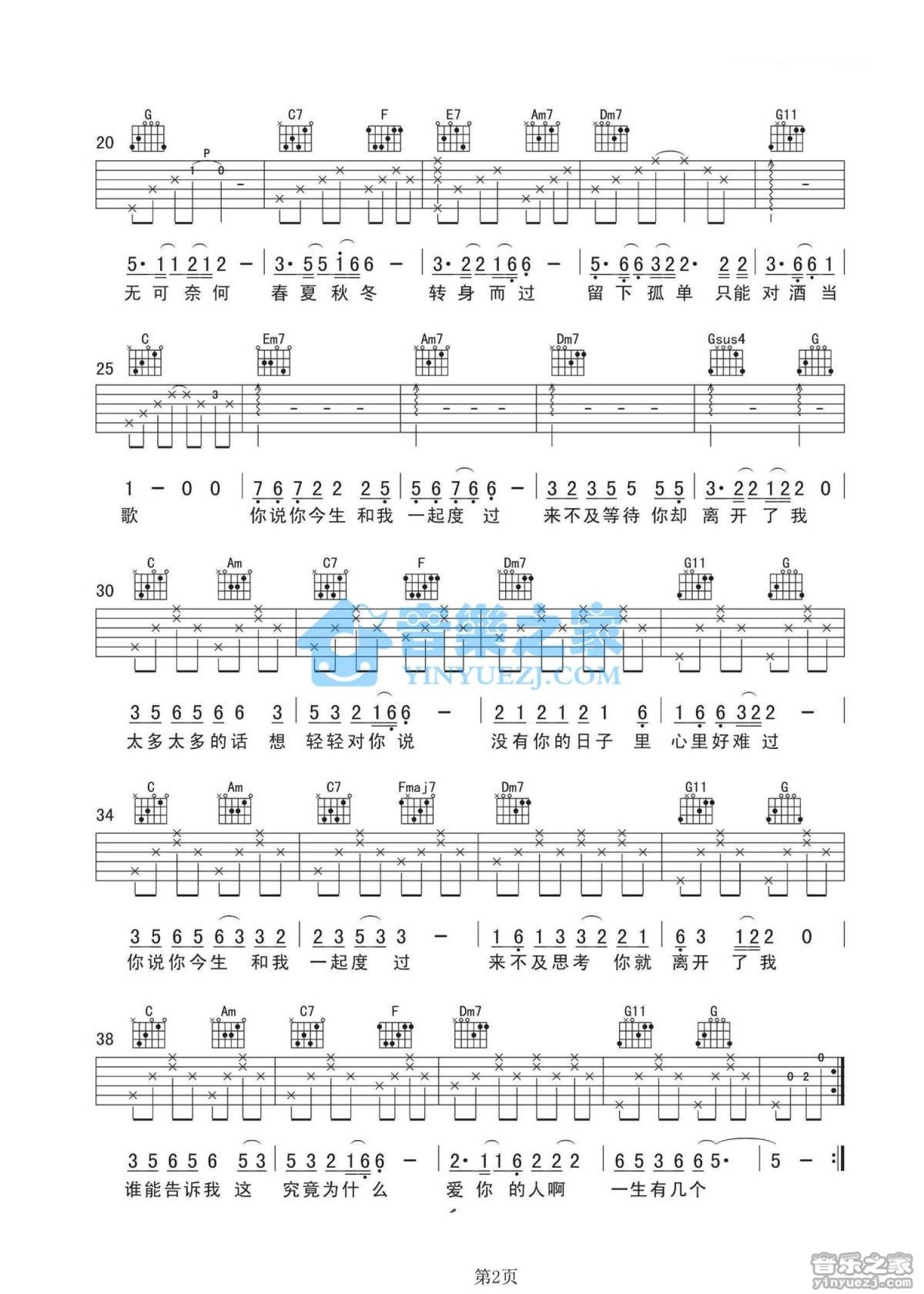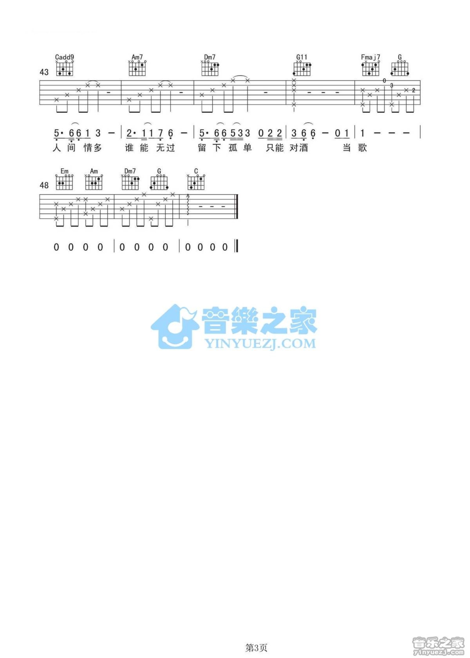 曲谱介绍: 丽江酒吧C调原版大军《孤单情歌》吉他弹唱六线谱