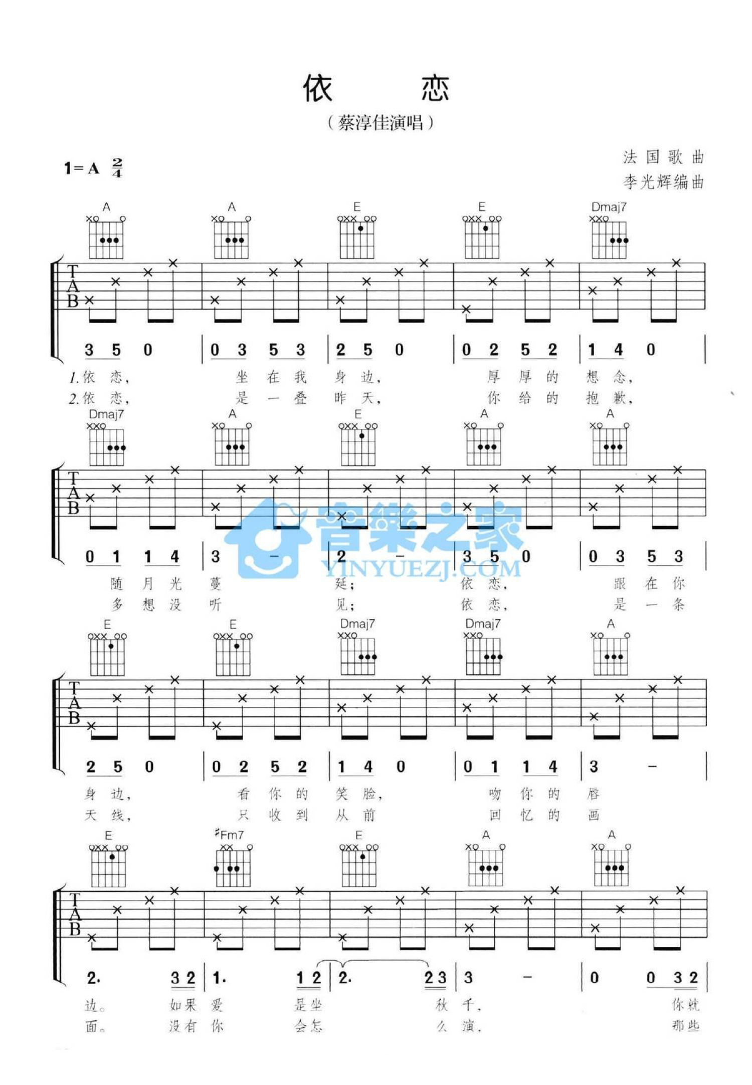 依恋吉他谱 - 蔡淳佳 - A调吉他弹唱谱